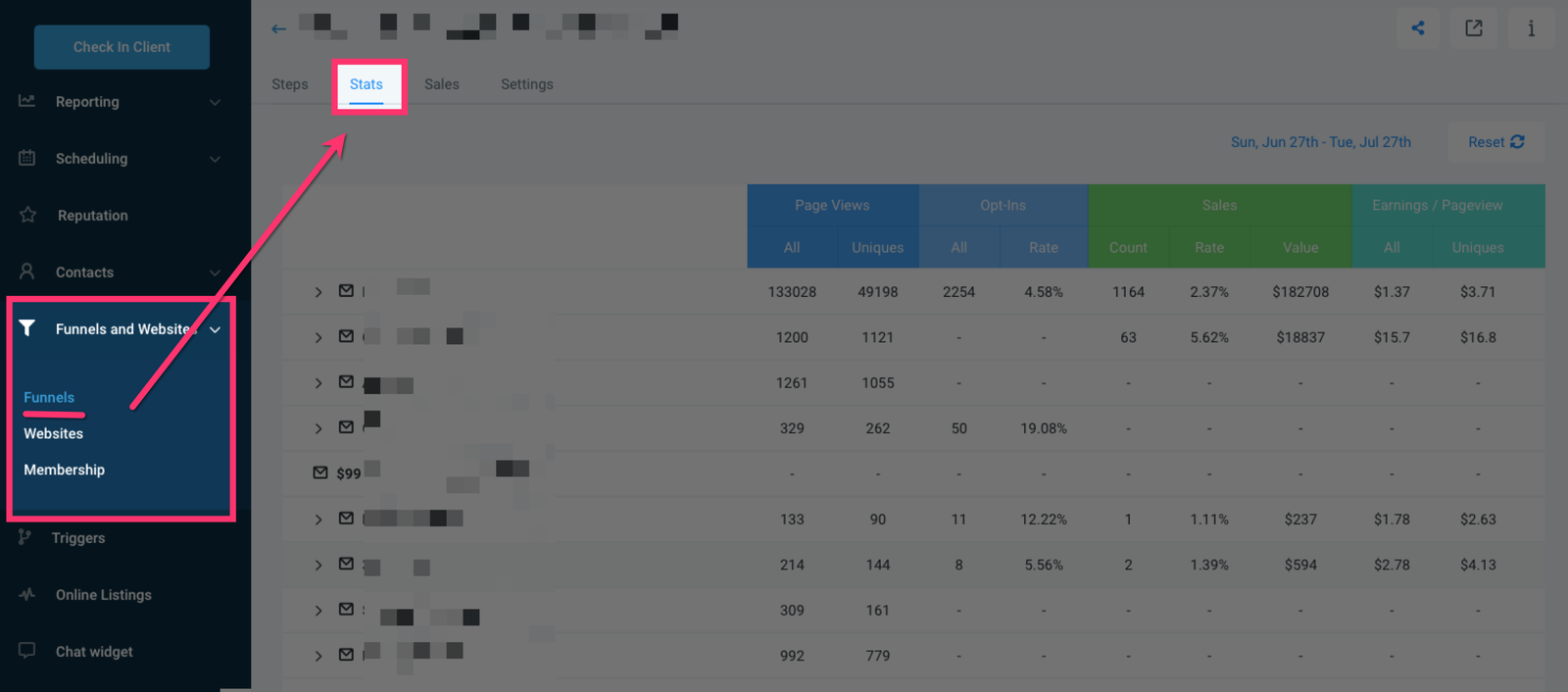 You can view the statistics for a funnel by going to Funnels And Websites > Funnels > Then clicking the Stats tab