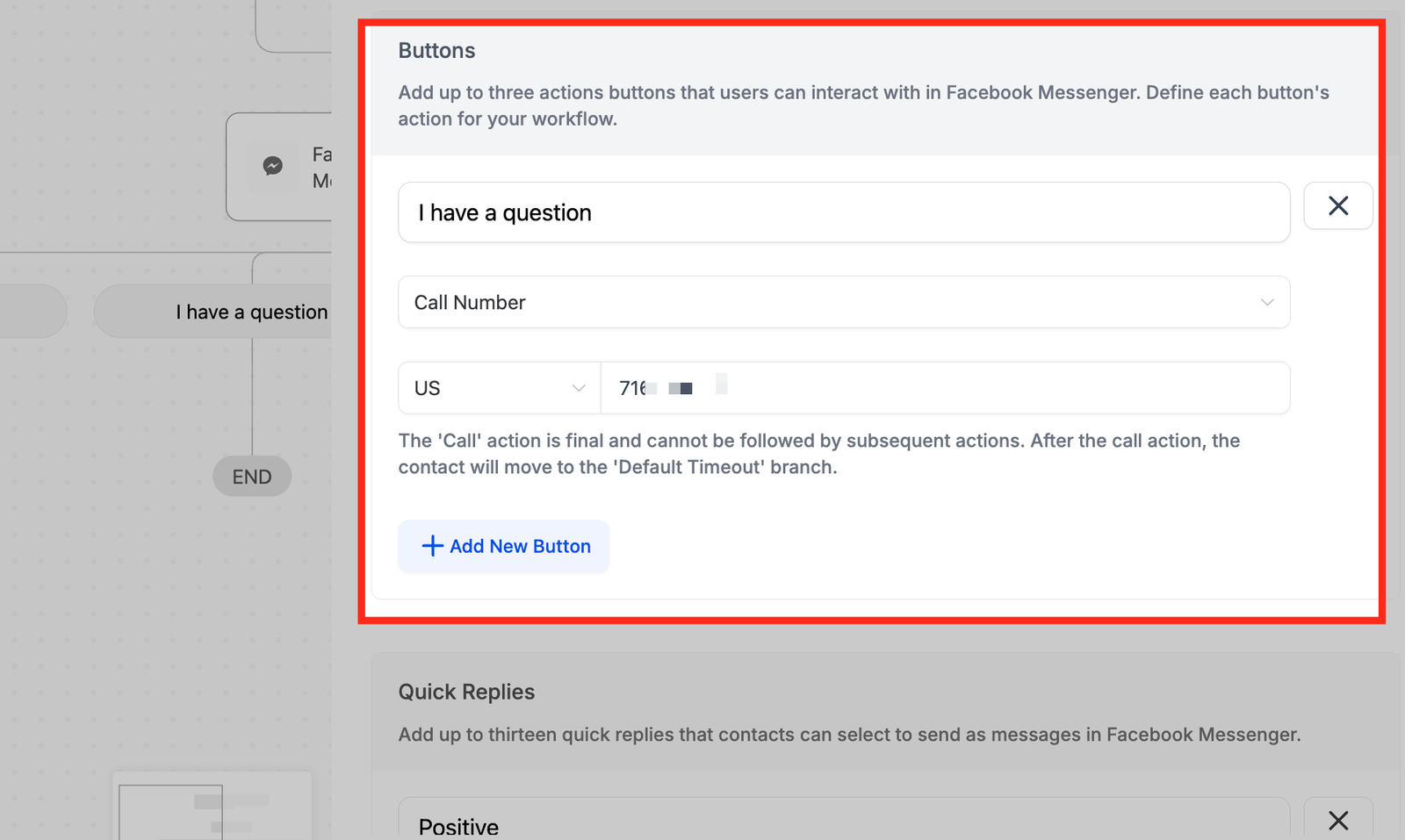 - In the setup area, you can add buttons for predefined options. In the option below, we have added a button with the option “I have a question” and that leads them to the call the phone number.