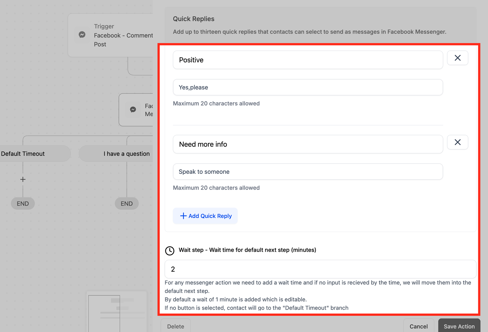 - Quick replies can be configured for facebook or instagram, using the Workflow actions – Facebook Interactive Messenger and Instagram Interactive Messenger. You can configure up to 13 quick replies each with a maximum length of 20 characters.