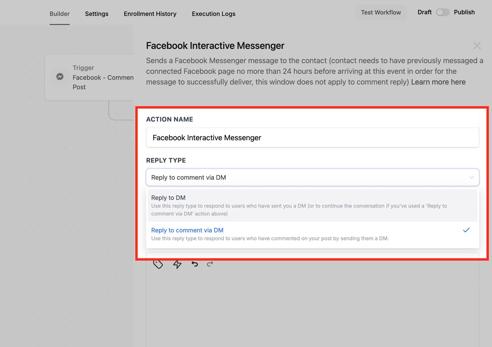 - Set up a trigger, such as a customer comment on a Facebook or Instagram post, and select the specific post if needed.