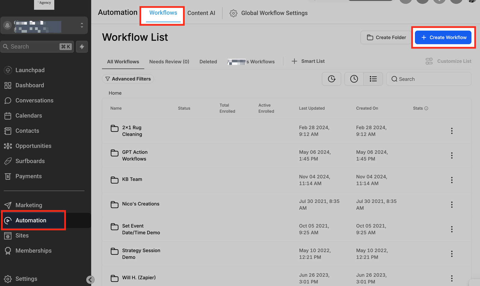 - Navigate to the automation section in your dashboard, select “Workflows” at the top, and “Create Workflow” or edit an existing one.