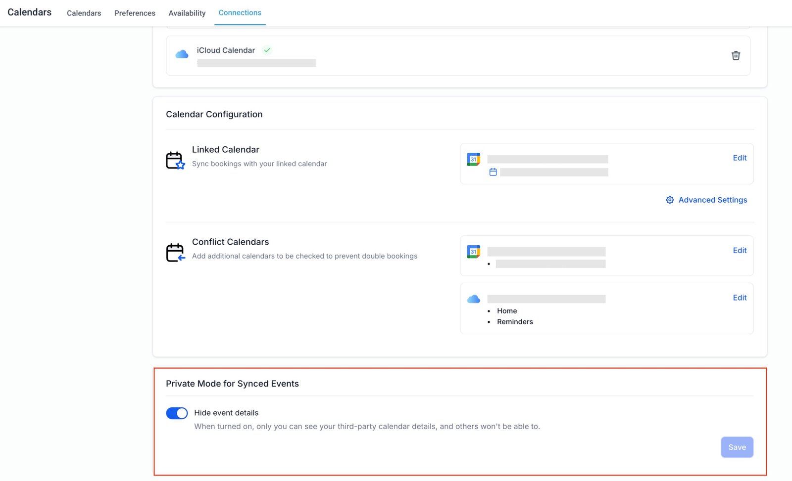 . When this setting is enabled, only the user who connected the calendar will be able to view the event details, ensuring that others cannot see them in the platform. This feature is designed to