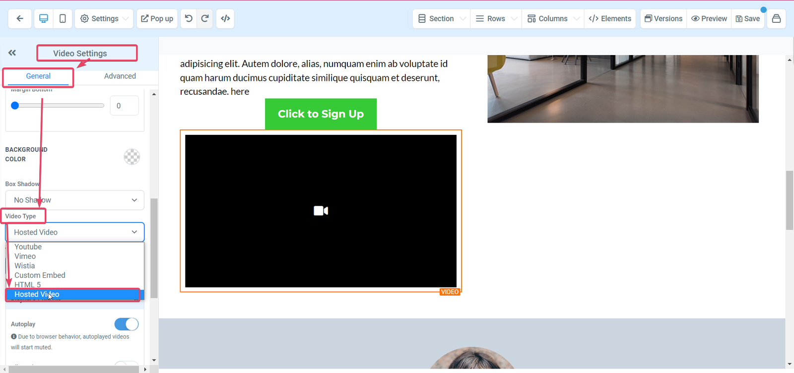Click on the Video Element, Go to Video Settings on the left and scroll down to Video Type > Choose Hosted Video: