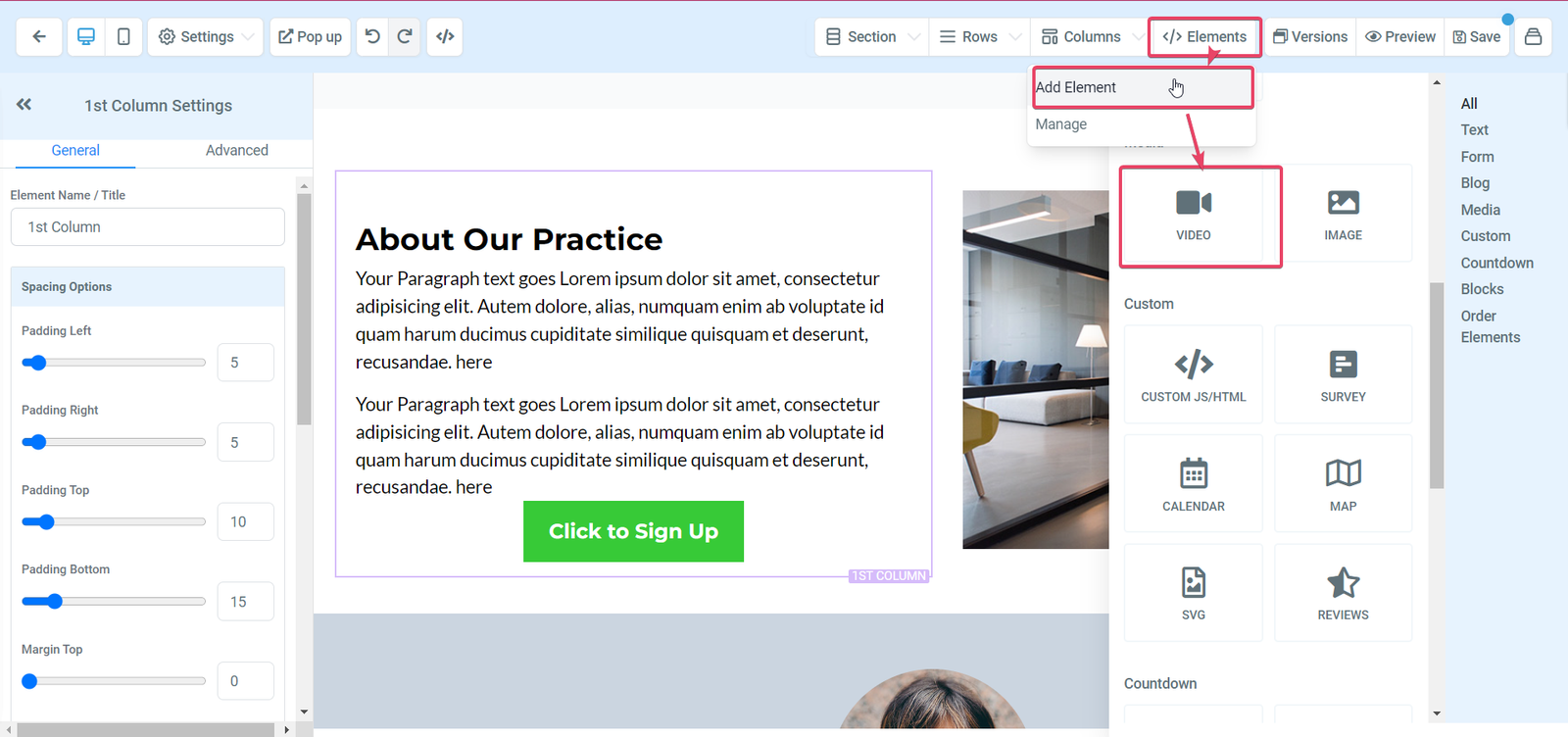 To make use of the Hosted Video feature, add a video Element to your funnel: