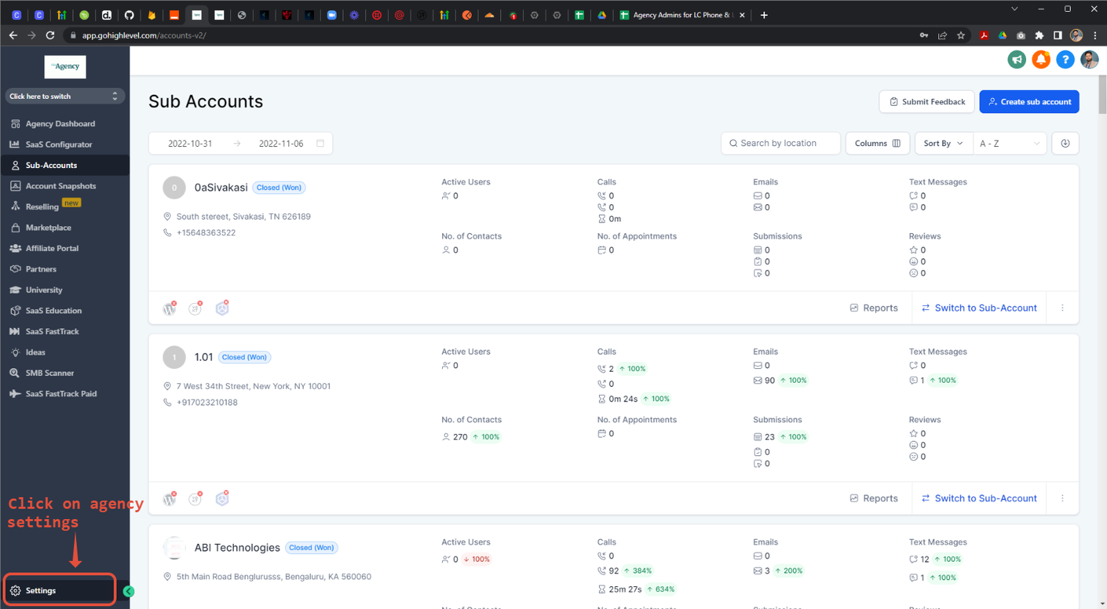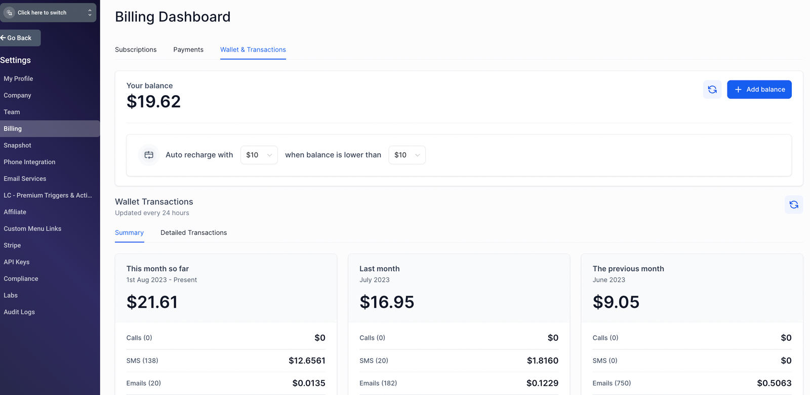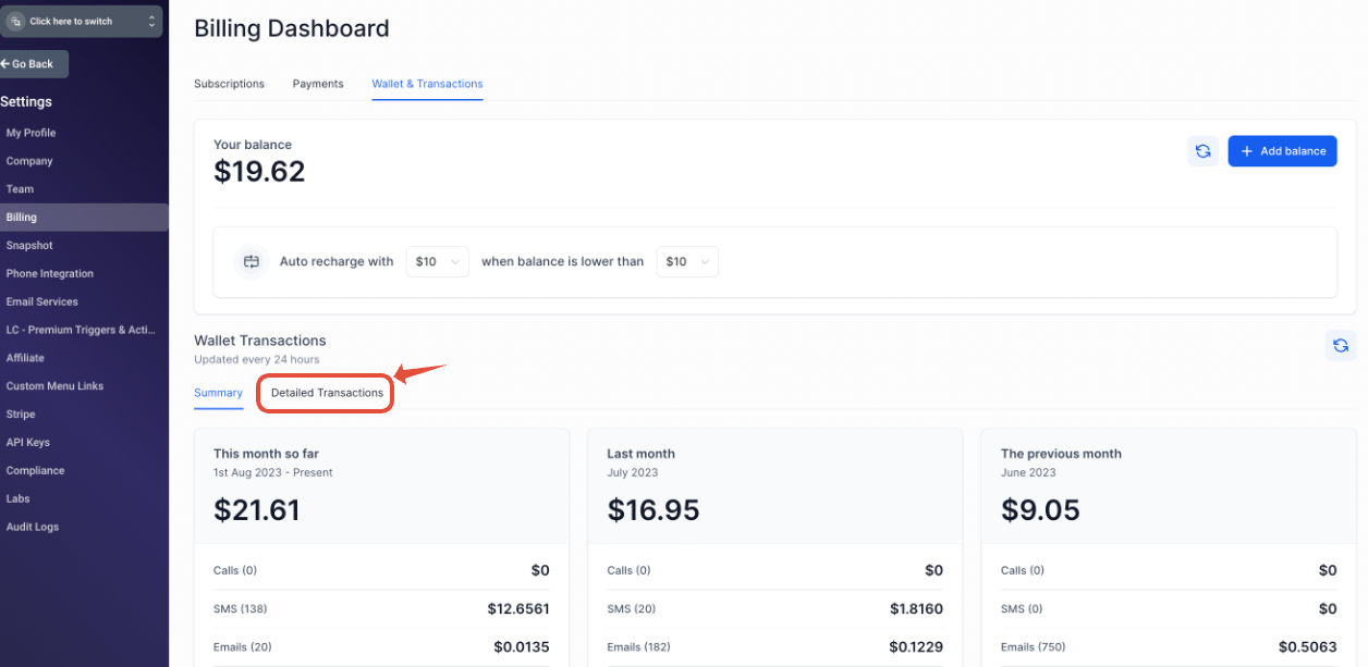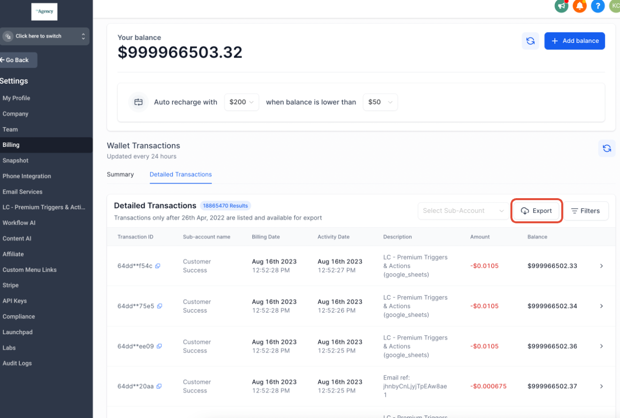 In your agency account, we provide you features that help you analyze your agency’s spend on LC Communications (LC Phone, LC Email, WhatsApp, etc)