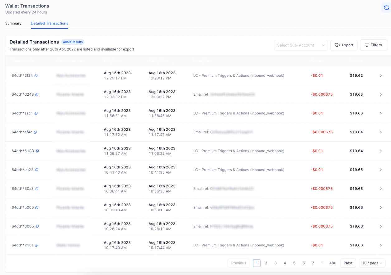 In the Phone Numbers ➝ Usage Summary page which shows Agency transactions for that subaccount, the wallet balance for the agency is used across all the subaccounts, so the wallet balance will follow a sequence when we look at a particular subaccount.