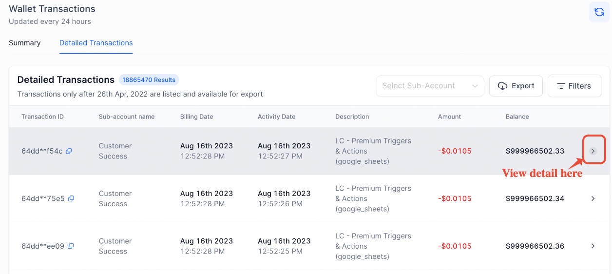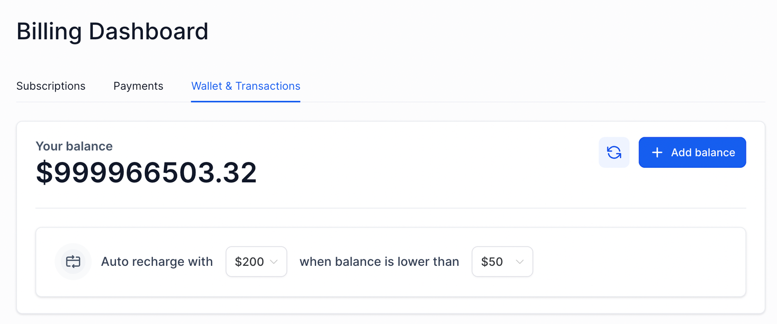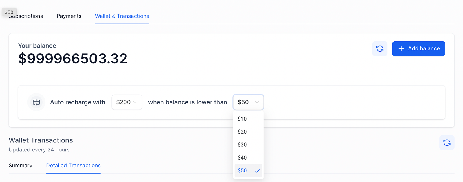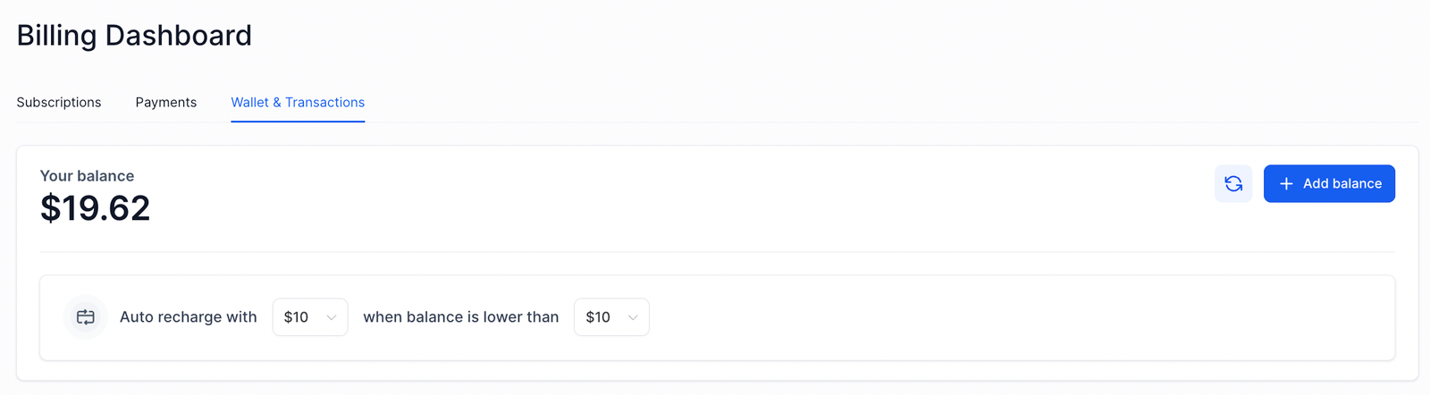Click on the ‘Billing tab‘ > Wallet & Transactions