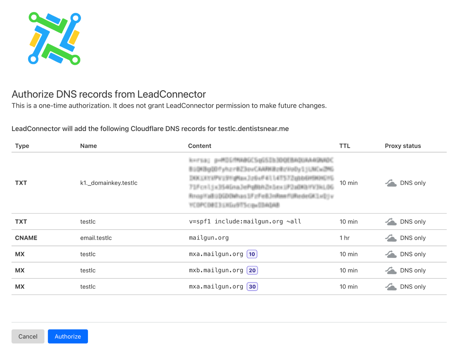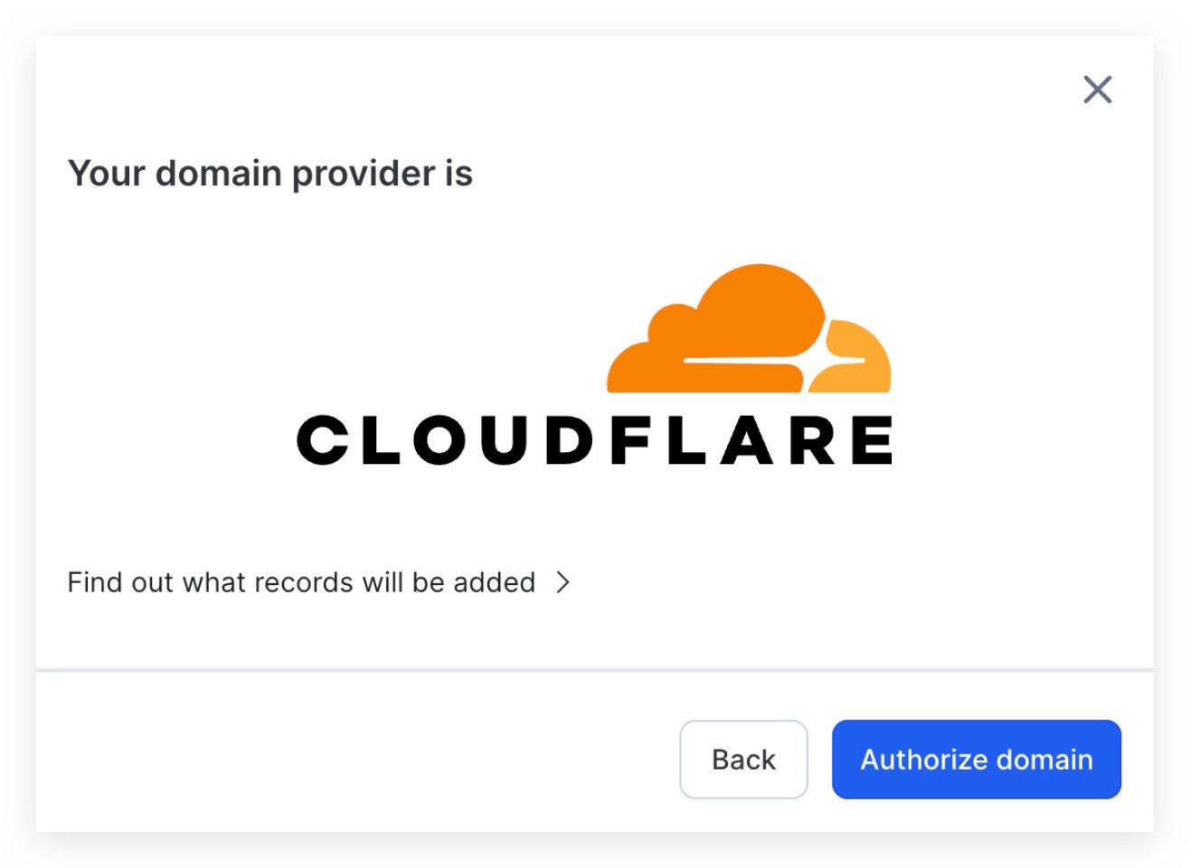 The example below shows the DNS provider is Cloudflare. To move forward, you will need to have the credentials to log into your DNS provider.Click “Authorize domain” on the next modal.