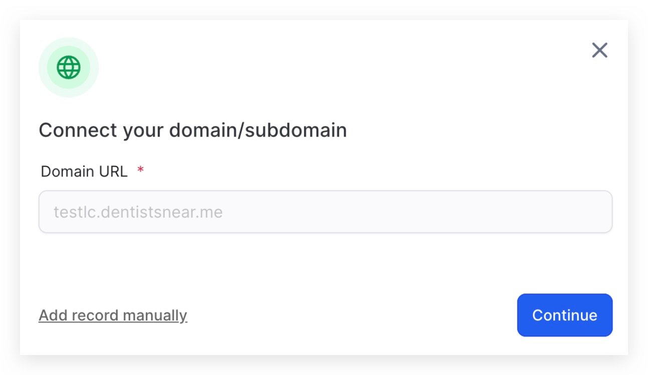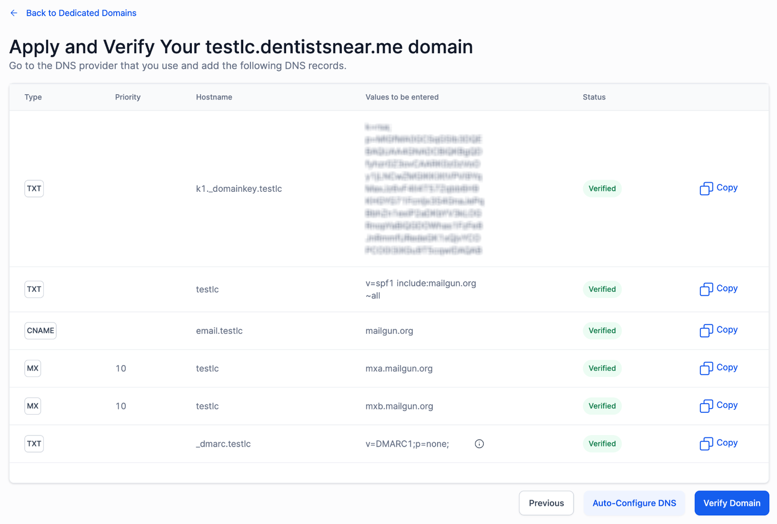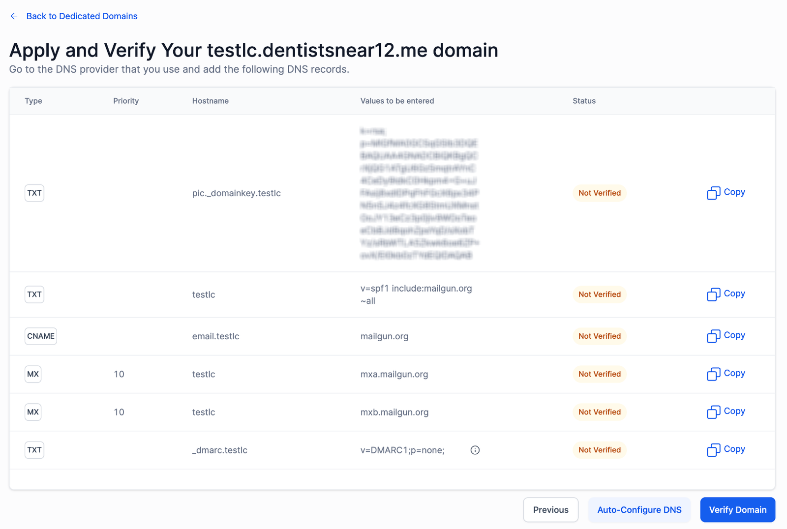 Note: The "Configure Domain" option may not be compatible with all DNS providers. If our system is unable to identify your provider, the records will be shown in a modal window. Click here to manually add the DNS records.
