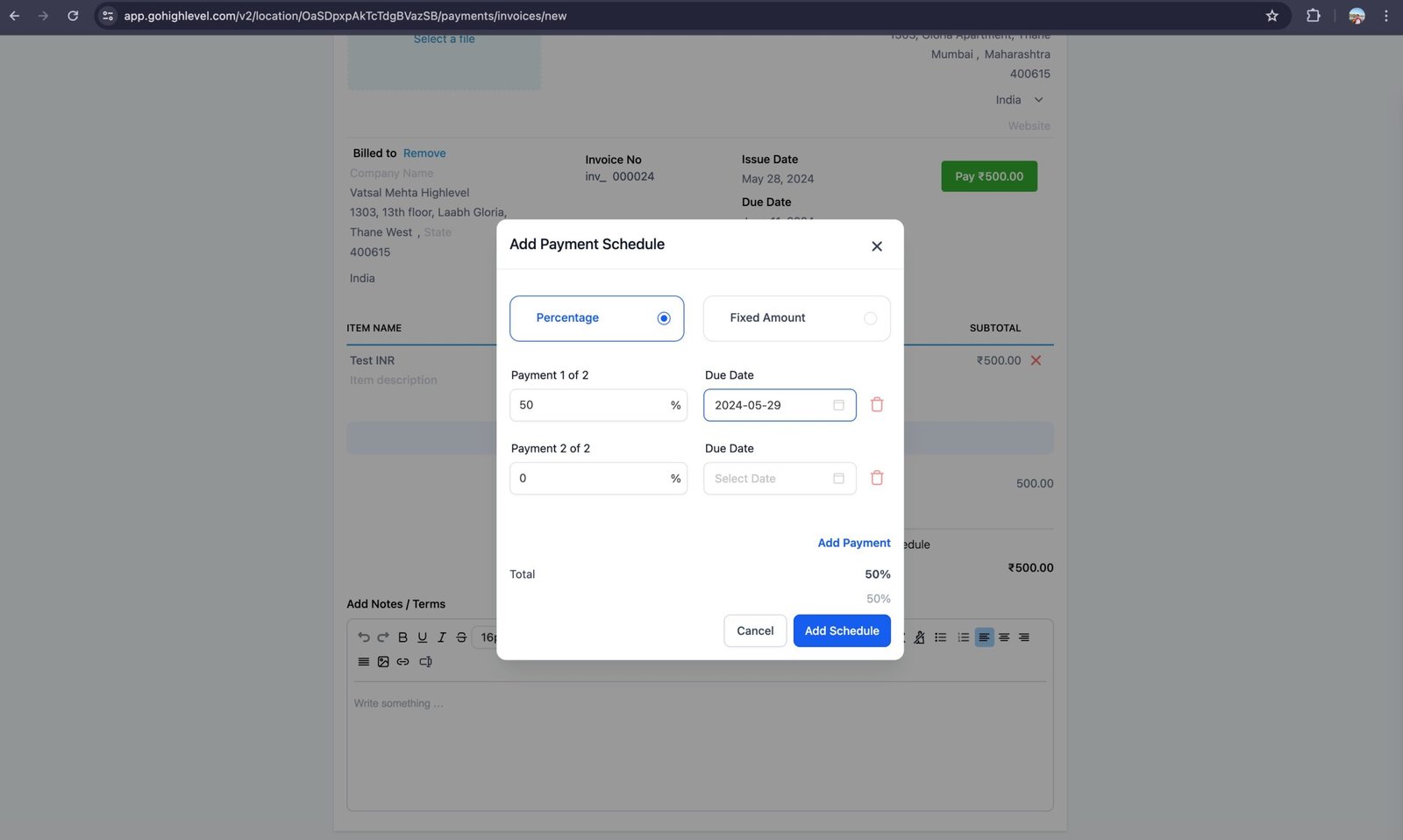 User will then pay the invoice and have an option to either select that payment schedule value or add other schedules as well by clicking on a checkbox