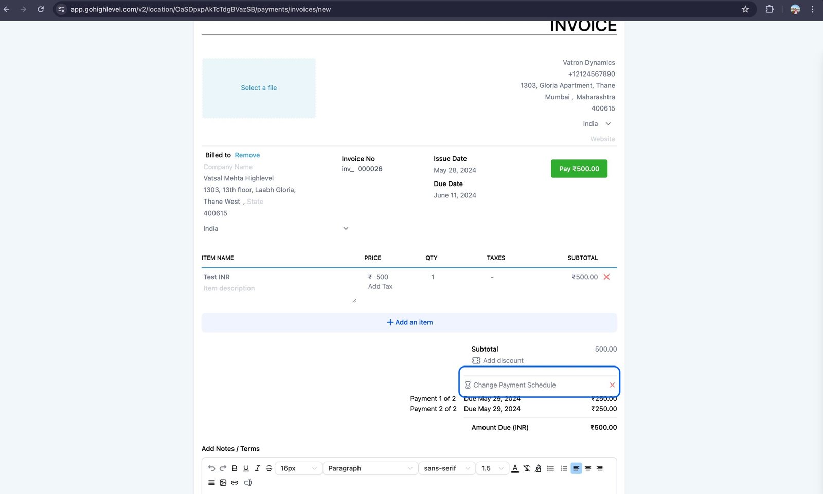 - Payments can be done only in predefined split and user can choose to pay one or more installment at a go. An Invoice will get paid once all installment are paid.