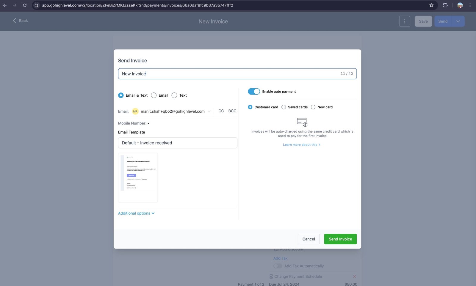 - Set up auto-payments: Click on send -> In the modal, enable auto-payments by clicking on the blue toggle while sending your invoice which has a payment schedule.