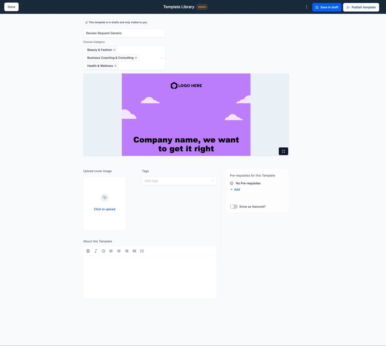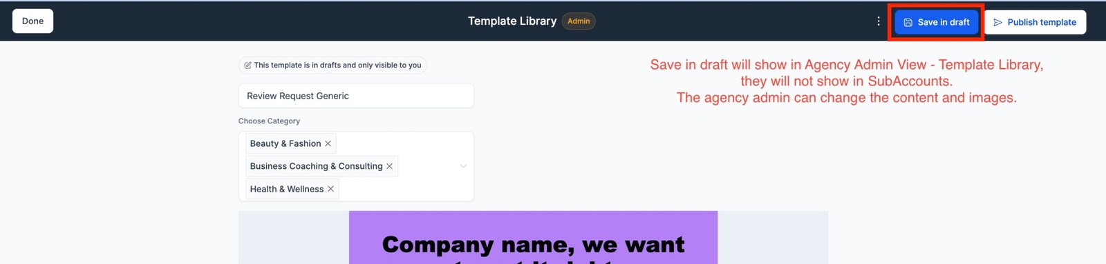 6. Once the template is ready, make it public (this will make the template visible in subaccounts to be used by subaccount clients) and make it draft will allow to just show inside template library admin panel to make future edits.