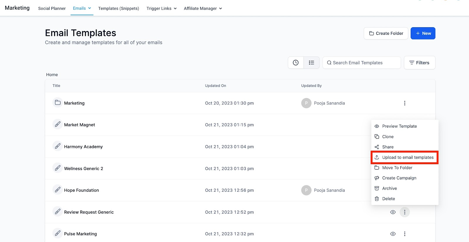 2. Click on the three dots in the list view and choose Upload to the Template Library