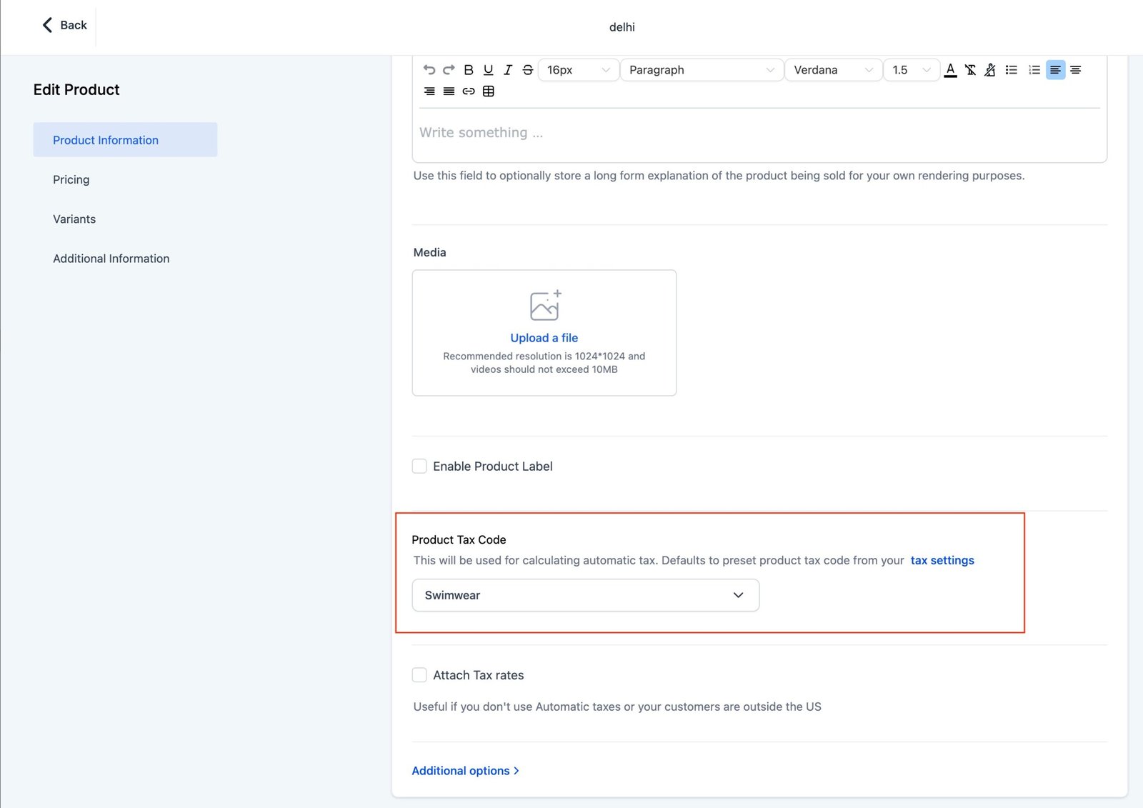 Specific product tax categories for individual products can also be defined separate from the default category while creating or editing products under Payments -> Products.