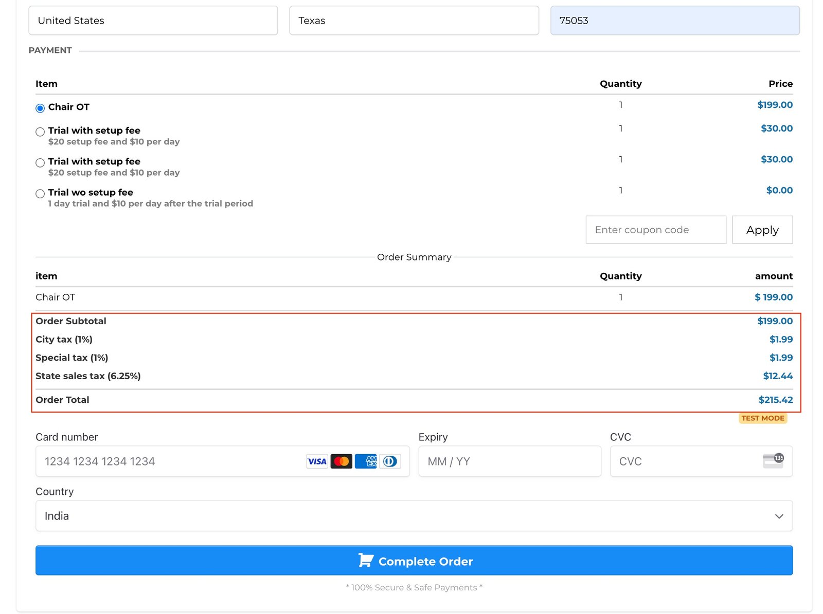 Taxes are applicable for both one-time and recurring products and breakdown on the amount paid will be available on the order details and transaction details page.