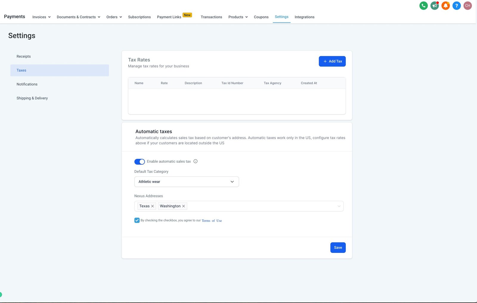 Automatic tax calculations can be enabled under Payments -> Settings -> Taxes using the toggle to enable automatic tax calculation. Businesses will be required to select the nexus addresses/states where they want to collect taxes along with defining a default product tax category which acts as the default category for all your products.