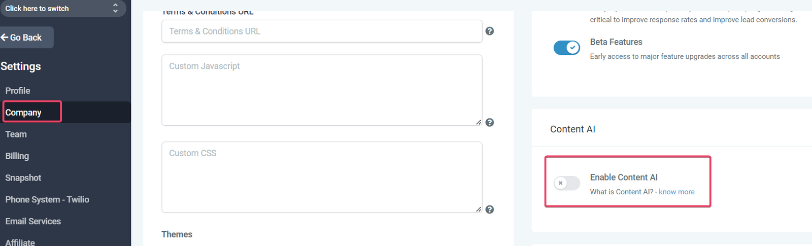Go to the Agency Settings >Company> Enable Content AI to enable Content AI.