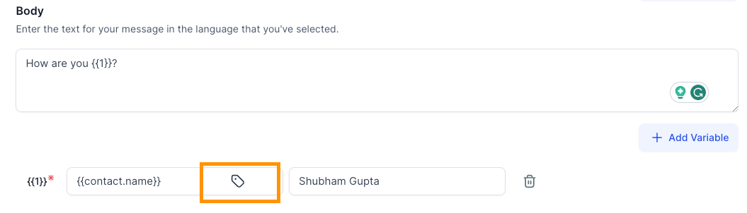 Step 2 – Click on tag icon and select the custom variable(as in this case it is contact name) and a sample text(Shubham Gupta in this case).