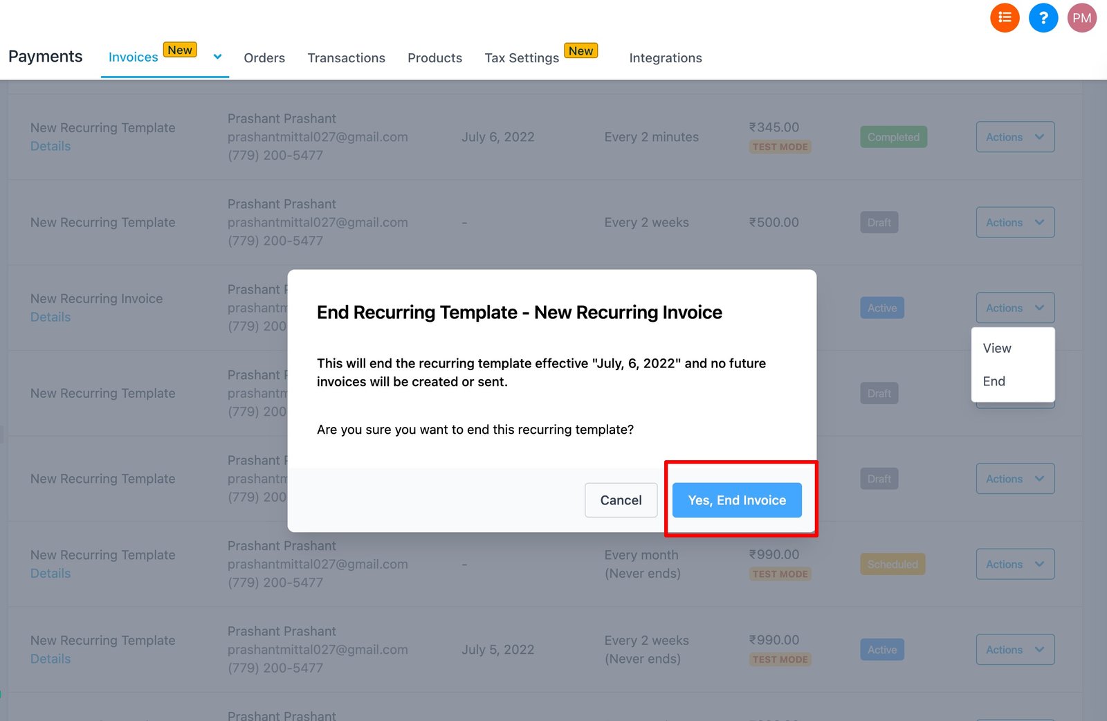 Active or Scheduled recurring invoices can be stopped from sending out any future invoices from the Recurring Templates list page. Select the End option from the Actions dropdown and confirm the same as shown below: