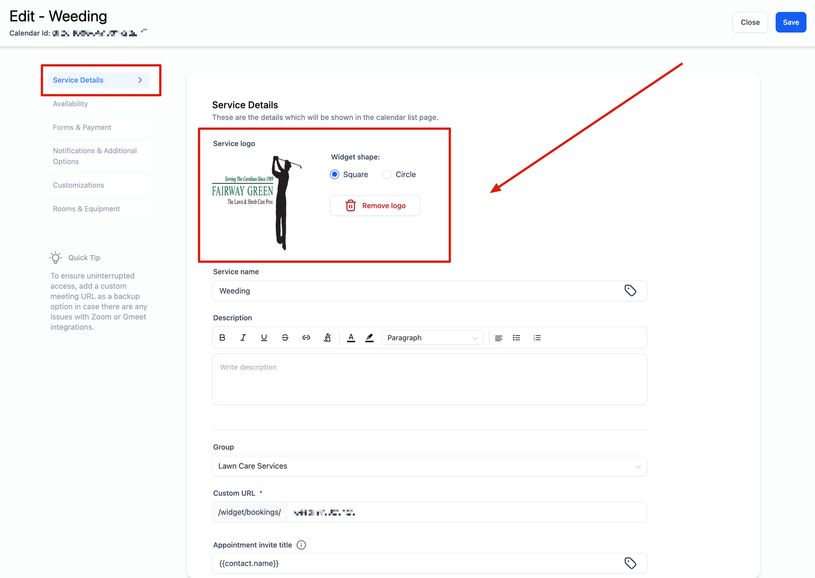 Upload your Service Logo – This is the image that will appear on the Appointment Booking Widget for your Service Calendar