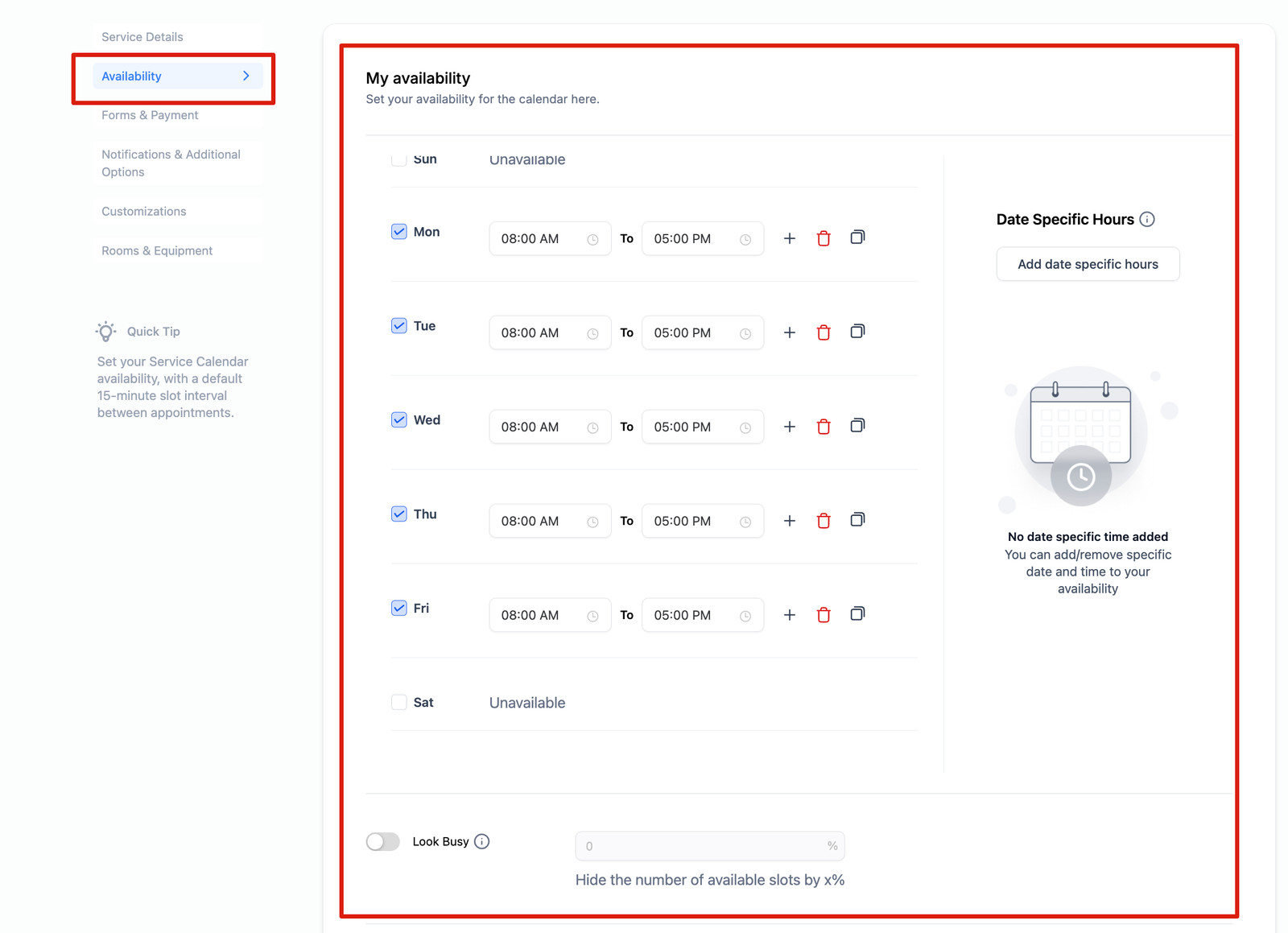 - Date Specific Hours: Set Date specific hours that allow you to customize your availability or unavailability for specific dates. You can add specific dates and define hours applicable only to those dates.