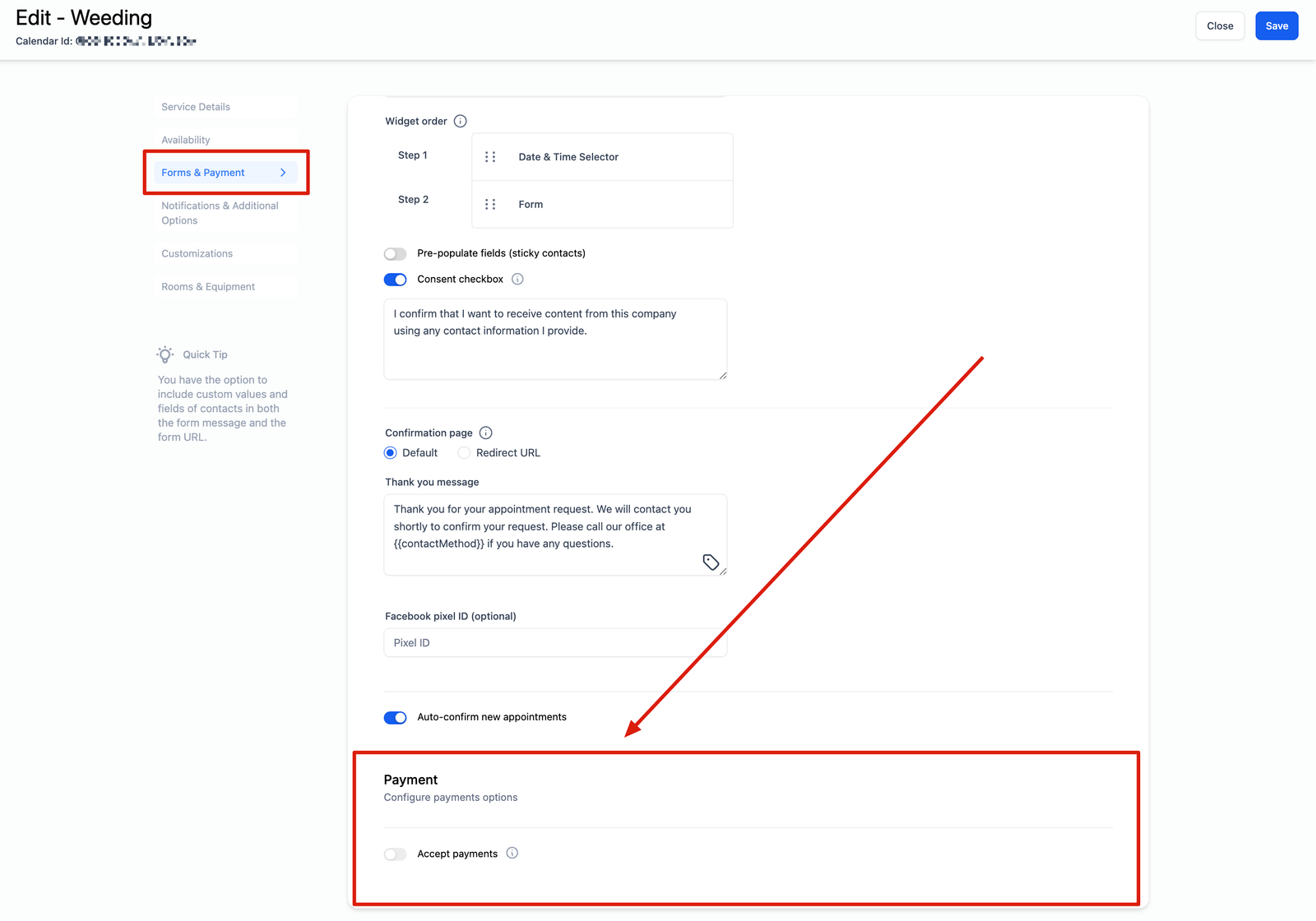 Payments – If you want to accept payments for bookings, ensure that your payment gateway is integrated. Once set up, you can specify the payment amount and start collecting payments. It’s important to note that payments are only applicable to the main attendee and not for guests.