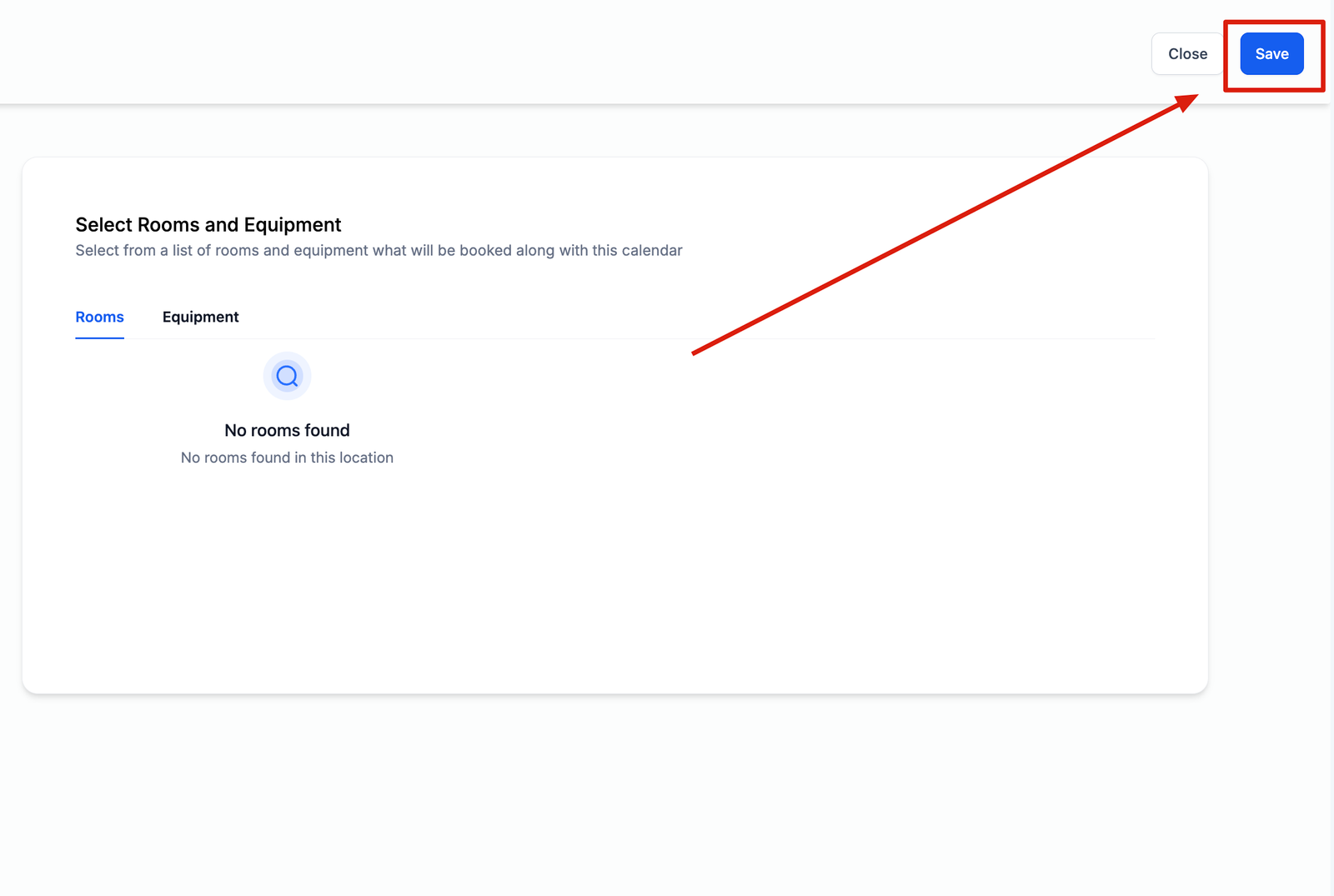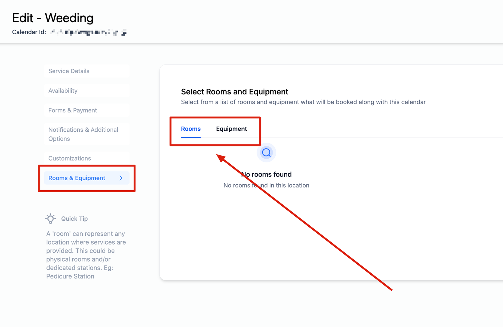 You can select from a list of rooms and equipments that have been created. This will associate the selected rooms / equipments with the service calendar and will be booked along with this calendar.