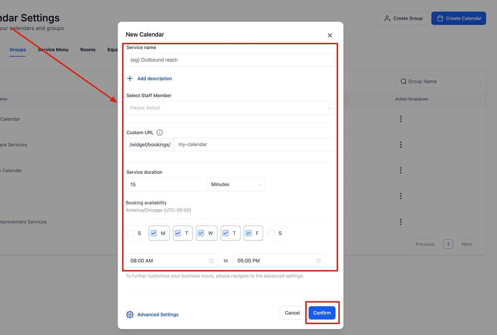 You can customize your service calendar further with Advanced Options. Simply click on Advanced Settings Button