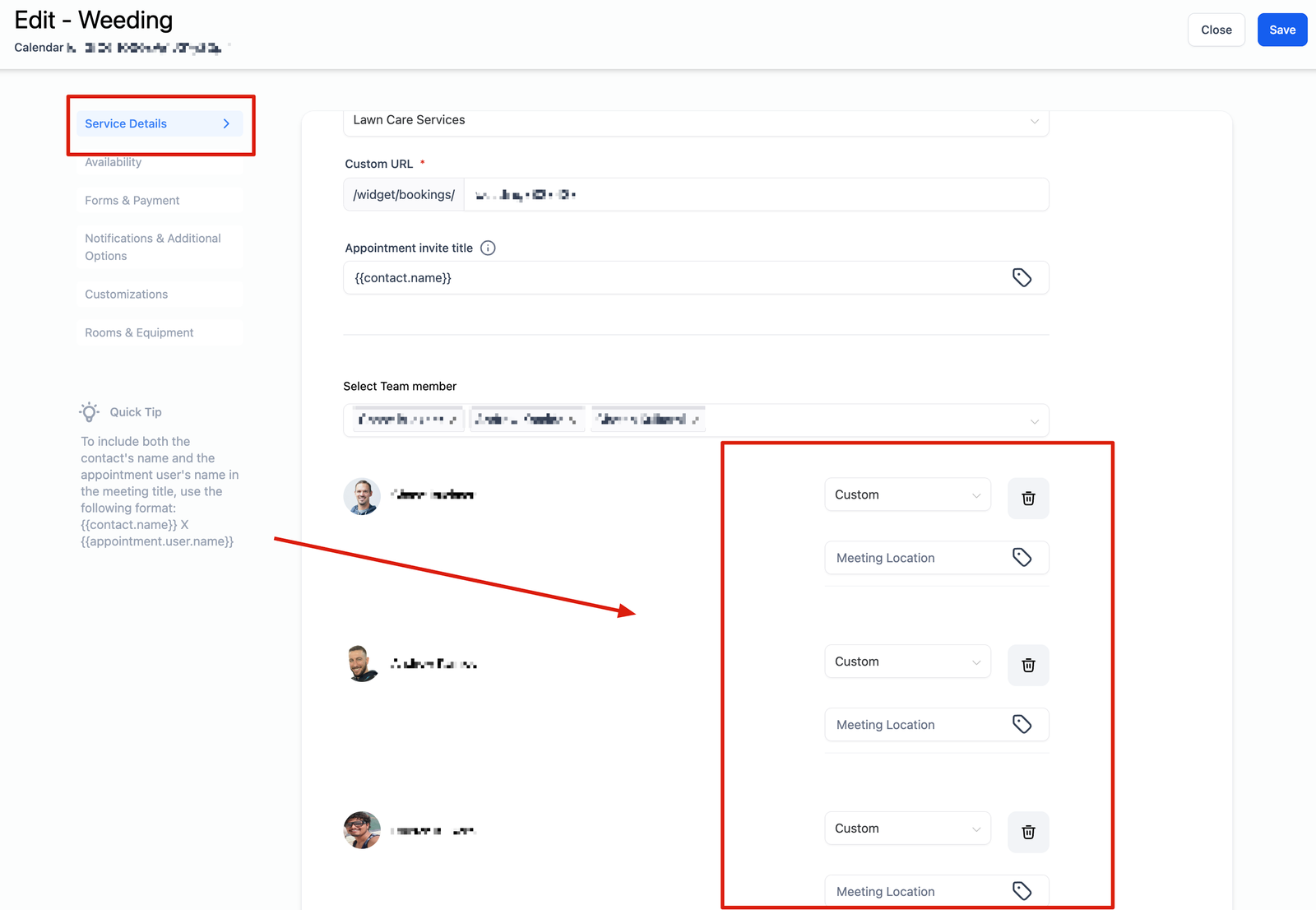 - Staff Assignment and Location: Select the staff members who will be assigned to the service you’re creating the calendar for. Once staff members are selected for a service calendar, you can configure their preferred meeting location from the advanced settings. Available Meeting Locations: