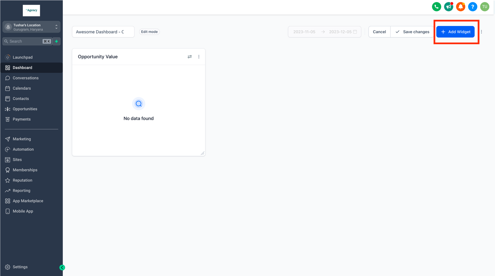Click on “Add Widgets” to introduce new custom widgets to your dashboard. For a detailed guide on adding custom widgets, refer here