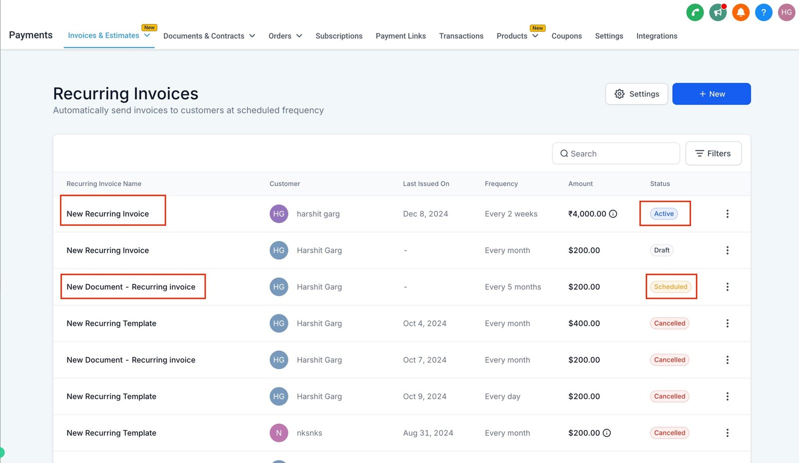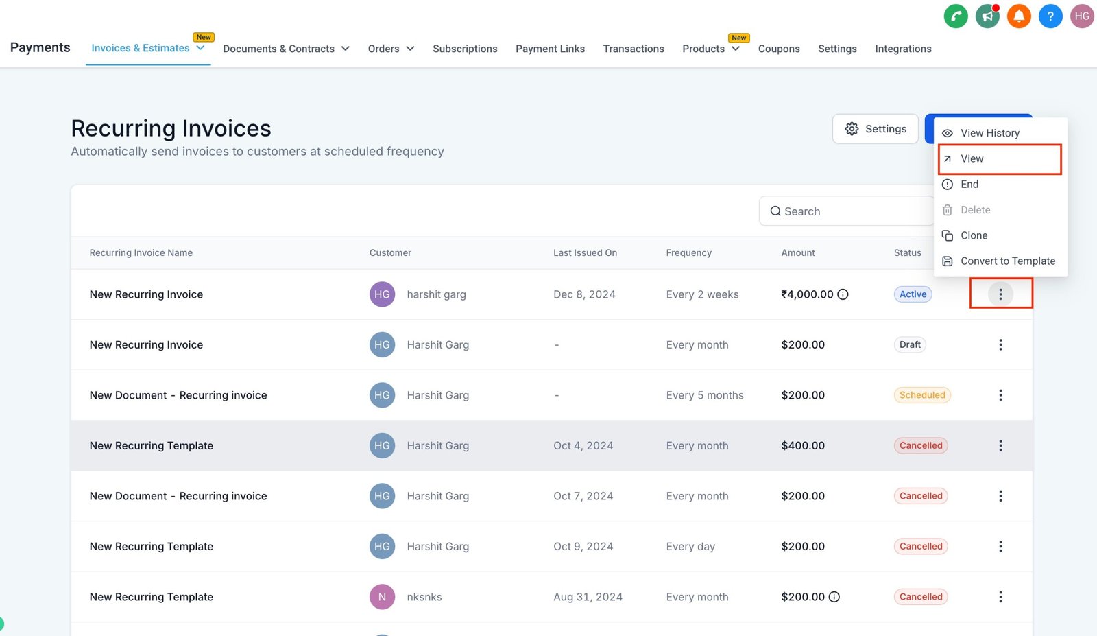 View the Invoice to Edit: Choose the active or scheduled recurring invoice you wish to modify.