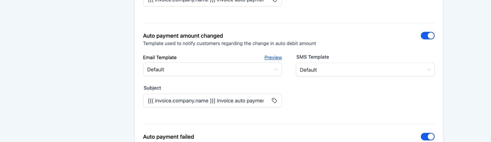 Customizing Email Notifications: Go to Invoice Settings and visit customer notifications. Edit the Auto payment amount changed notification to modify the subject line, message body, and other relevant details of the notification email.