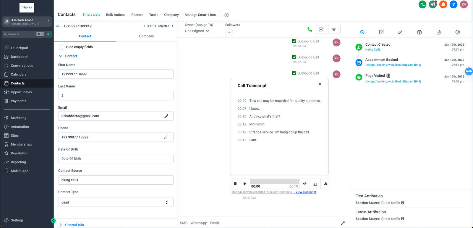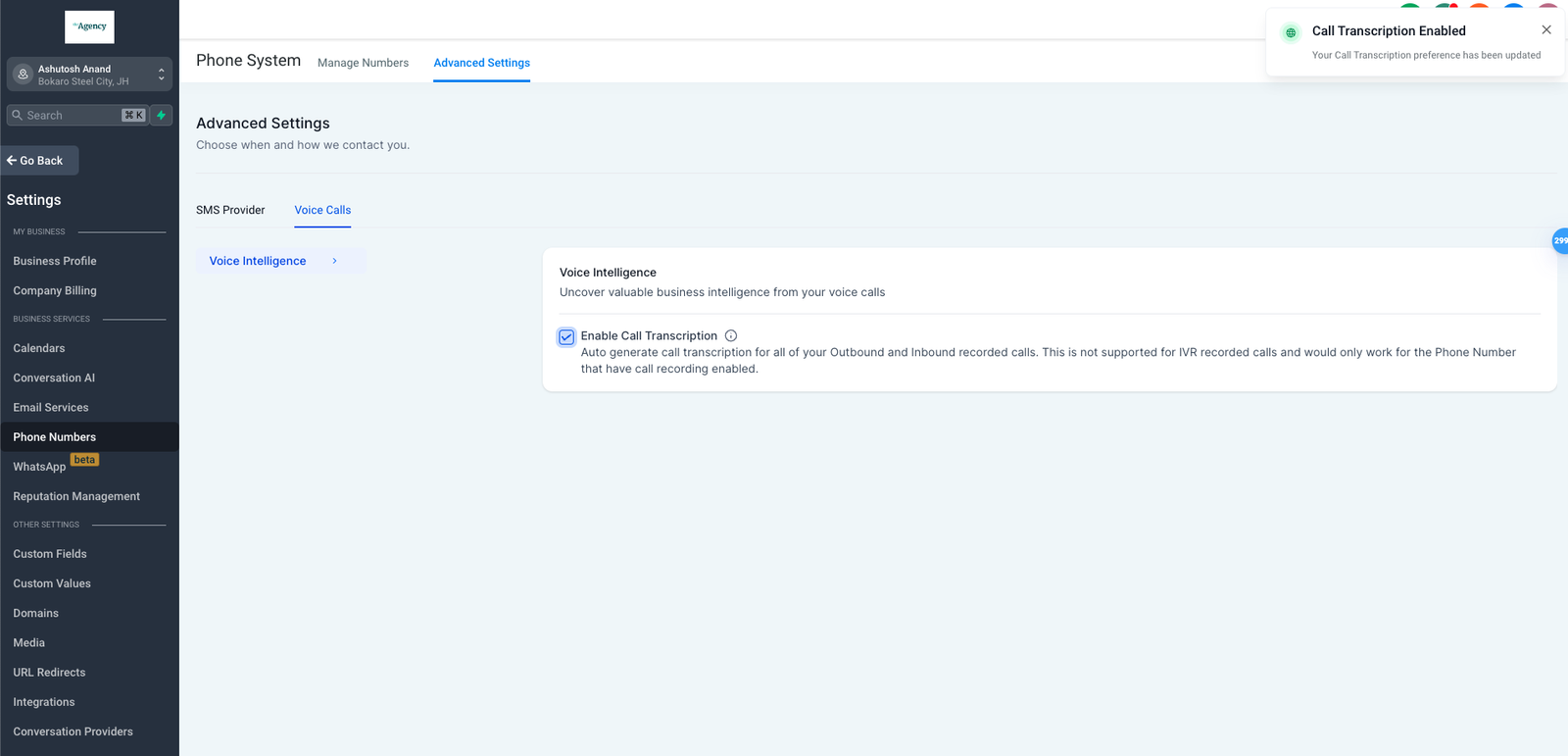 Location/Agency administrators can enable call transcription conveniently under advanced settings in the voice calls tab, streamlining the setup process.