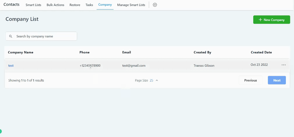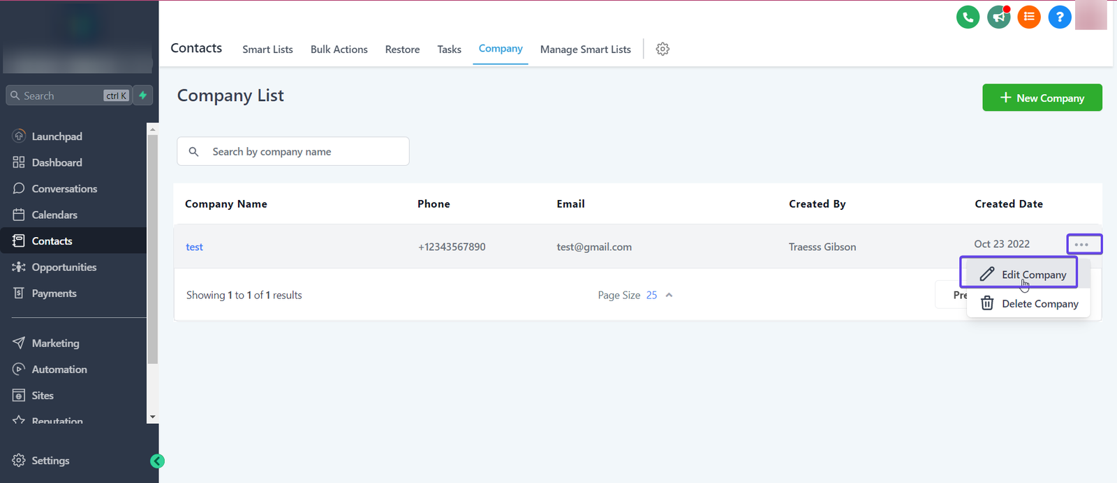 To edit the details of an existing company, Go to the Company Tab and hit the 3 dots next to the Company and hit Edit Company: