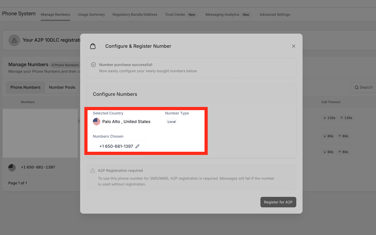 There you can see you have successfully purchased a phone number.