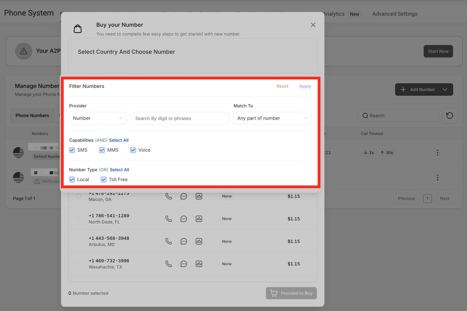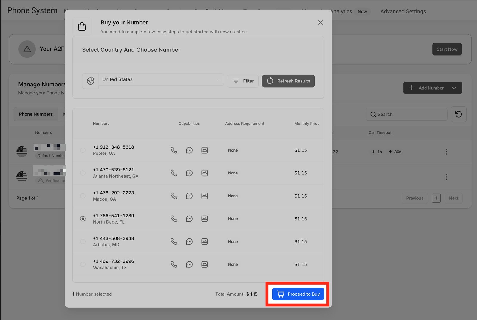 Step 6: Select the number of your choice and then click on Proceed to Buy Button in order to buy the number.