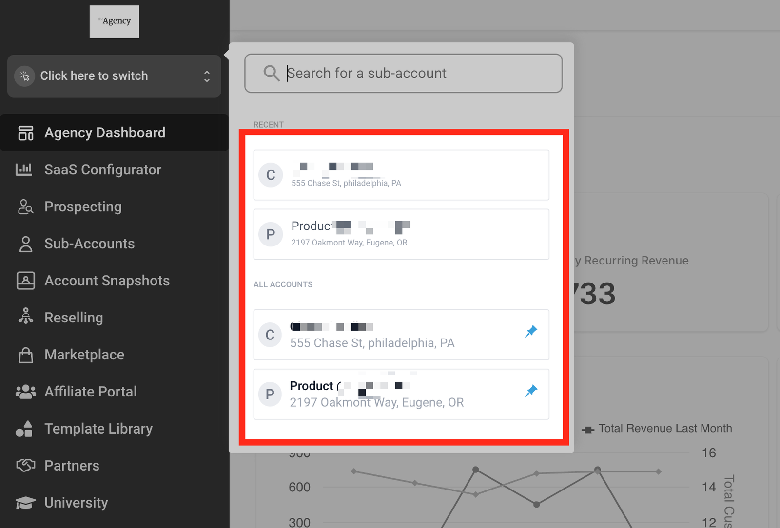 • Click the account switcher option and search for the sub-account where you want to purchase a phone number.