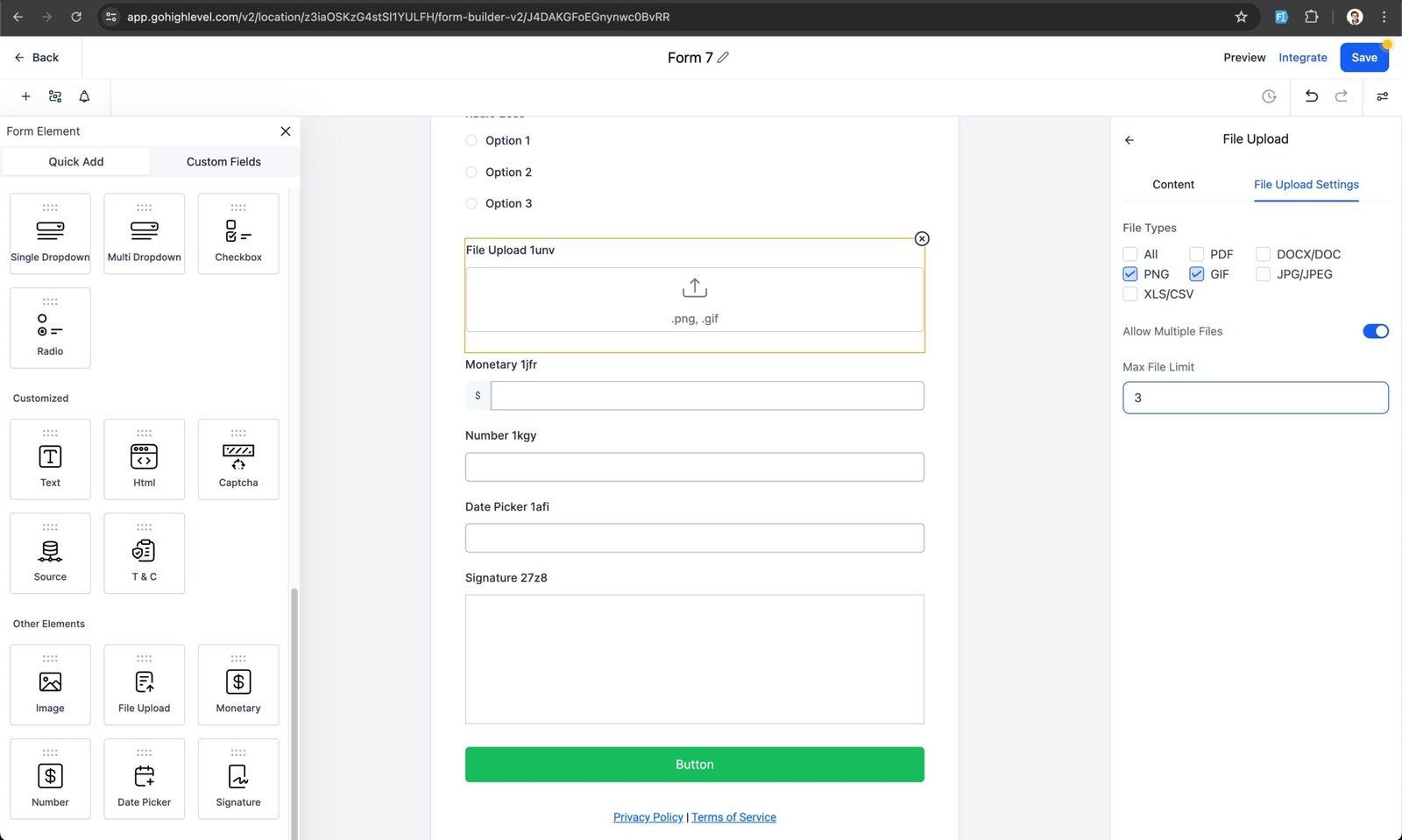 Customize the options for dropdowns, radio buttons, and checkboxes, or file input options for file upload fields. Set the custom field name and unique key if needed.