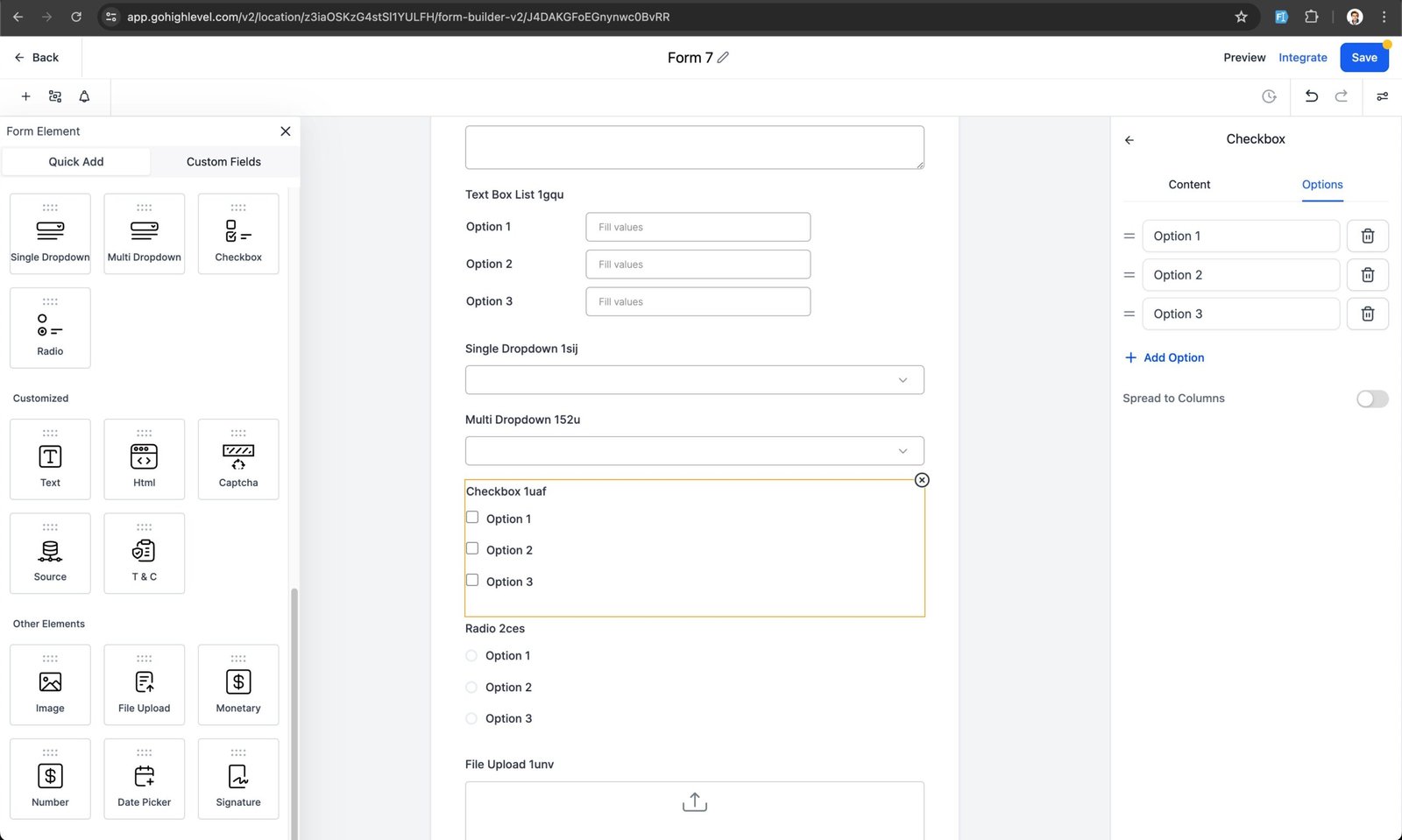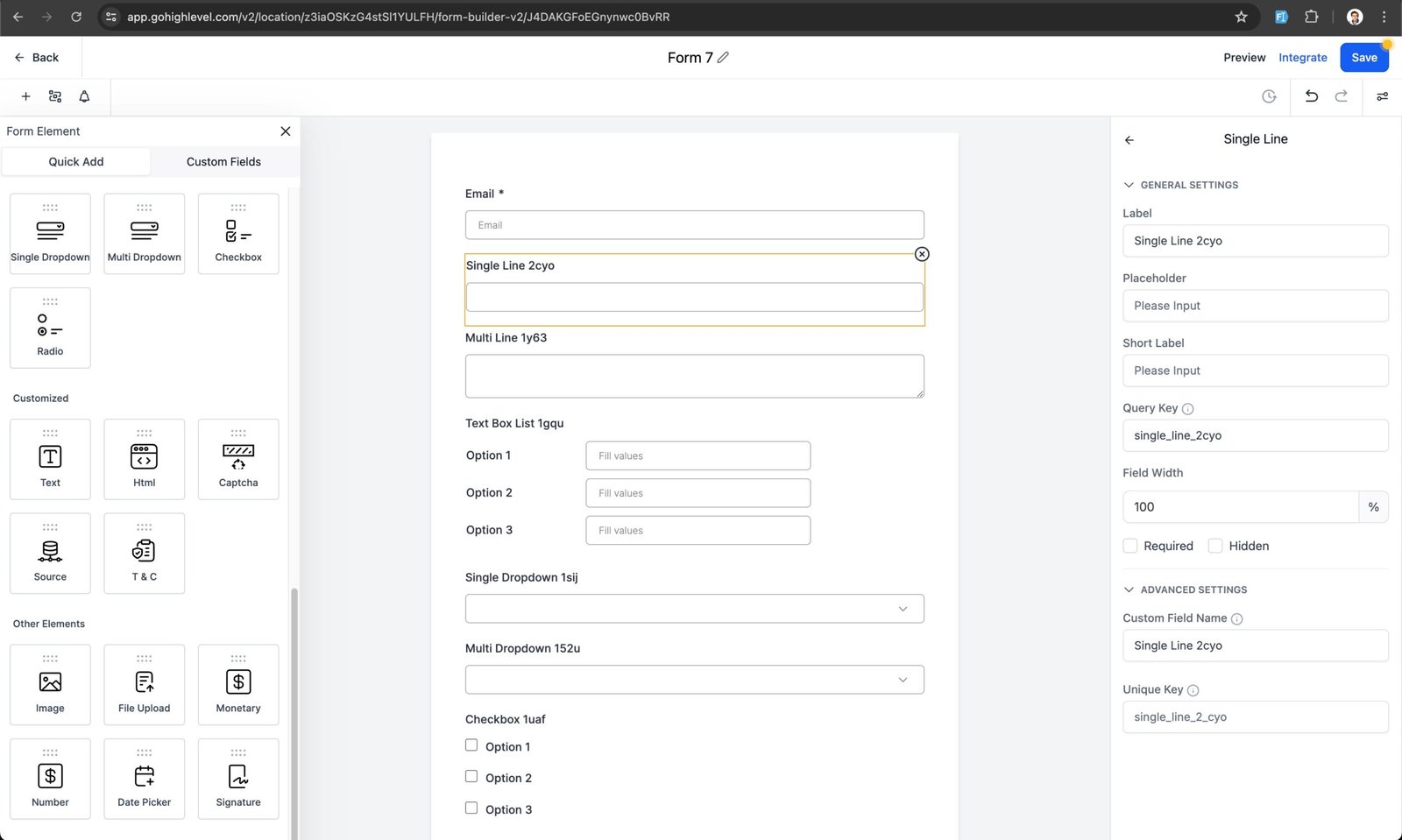 Customize options for dropdowns, radio buttons, and checkboxes, including file input options for file upload fields. You can set the custom field name and unique key.