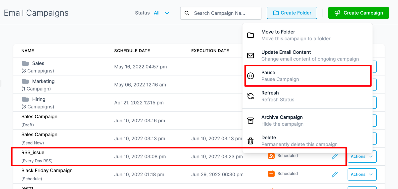 - Please check the details of the execution date, time, and time zone before scheduling! - There will be an option to delete or reschedule the email campaign. If the user wants to reschedule the campaign, they can click reschedule and set the date-time of the campaign. - The reschedule will be allowed before one hour of sending the email campaign. For example if the schedule date is 11 AM EST, it will allow us to reschedule till 10 AM EST. - There will be RSS Email Campaign has pause option will be available.