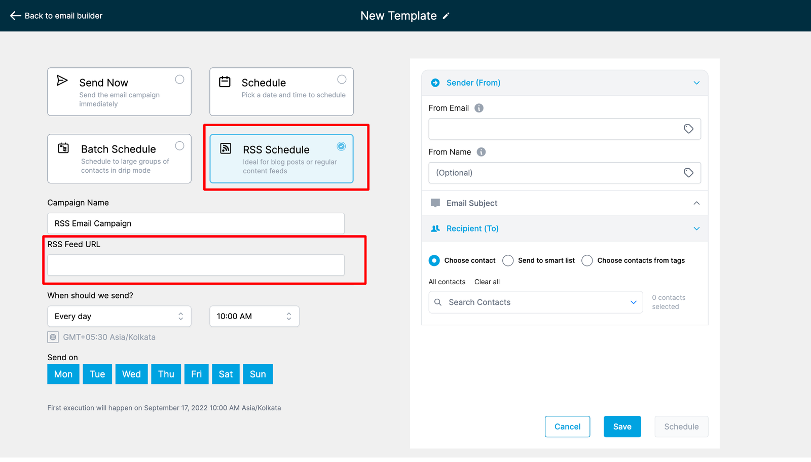 Step 9: The time when the RSS Email campaign is to be sent out
