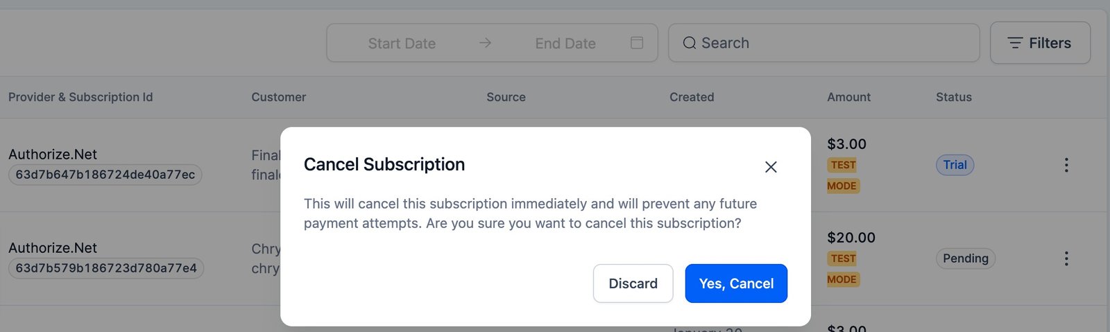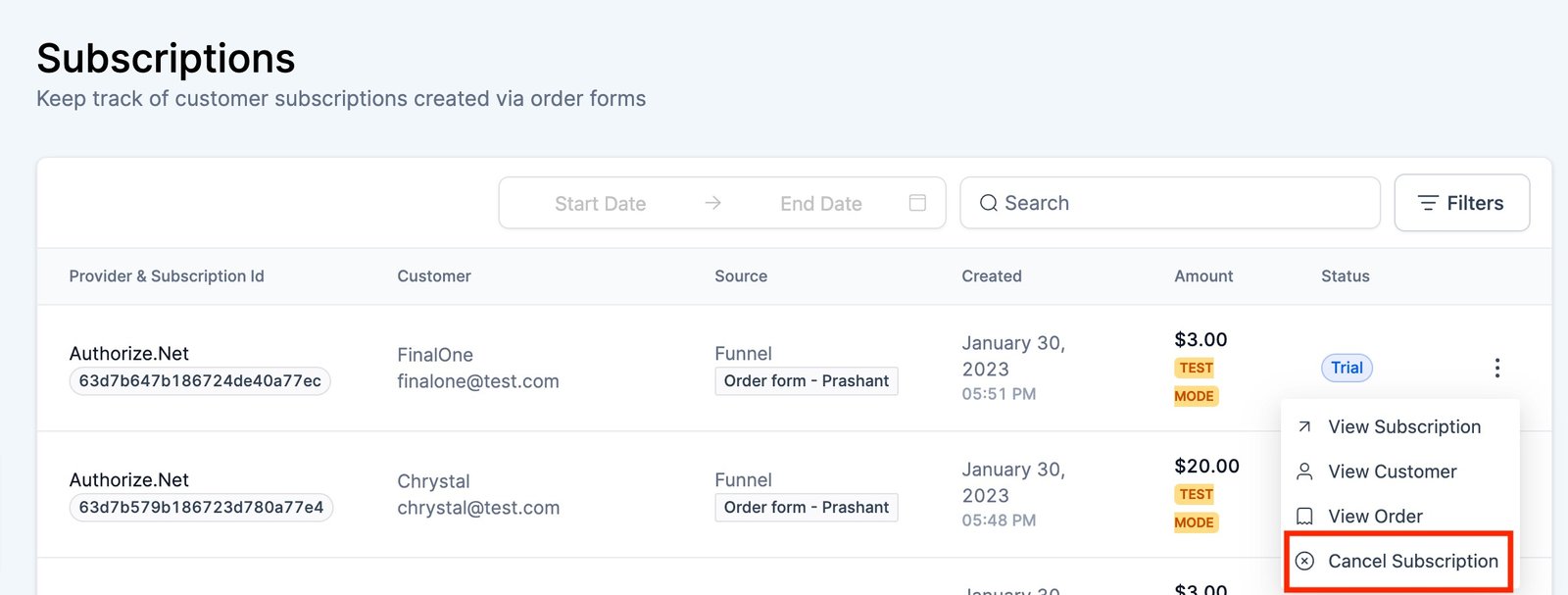 Subscriptions created using NMI/Authorize.net can be canceled within the Subscriptions page using the ‘Cancel Subscription’ action.