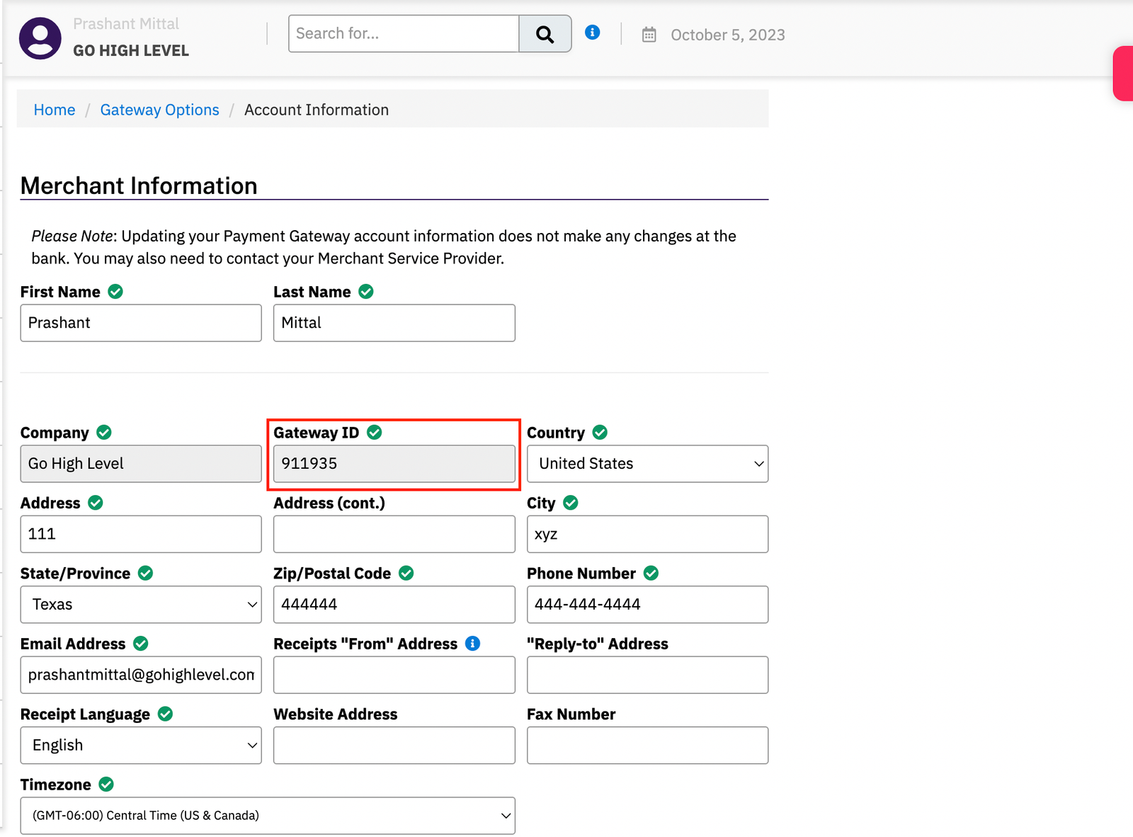 To get the gateway ID for your account, navigate to your merchant account. Head over to Settings -> Account Information and you will be able to find the Gateway ID for your account.