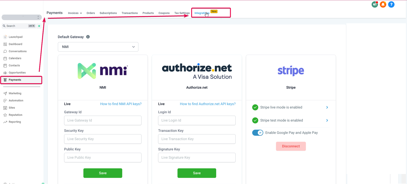 Once you have acquired the keys, please head to Payments> Integrations in your subaccount.