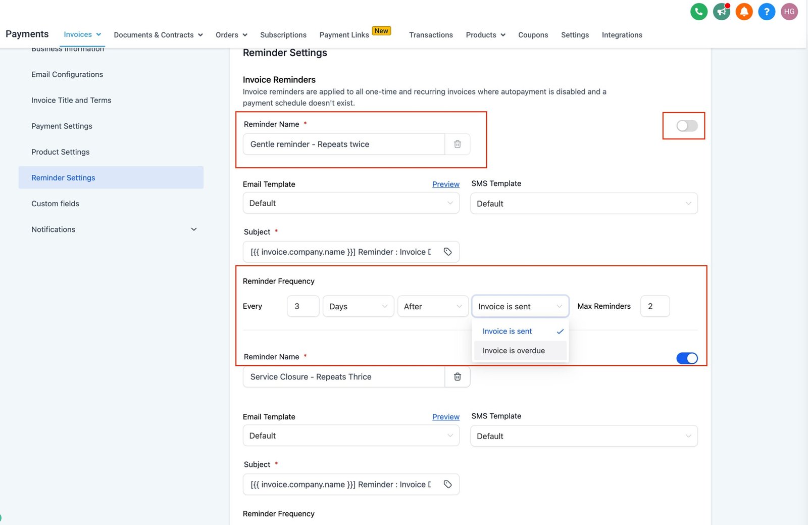 Relied on workflows to remind your customers? Now, increase your payment conversions on invoices by setting payment reminders for your customers directly from settings.