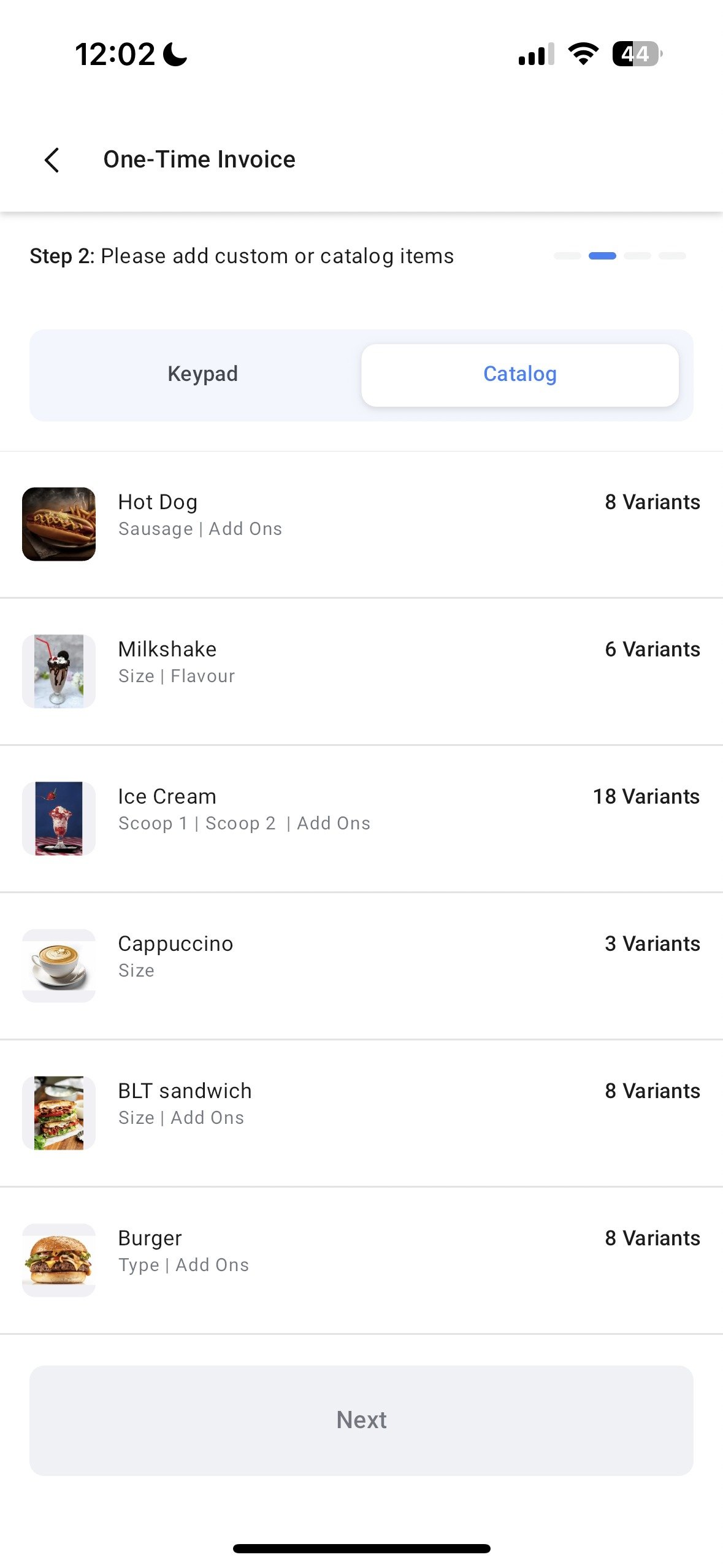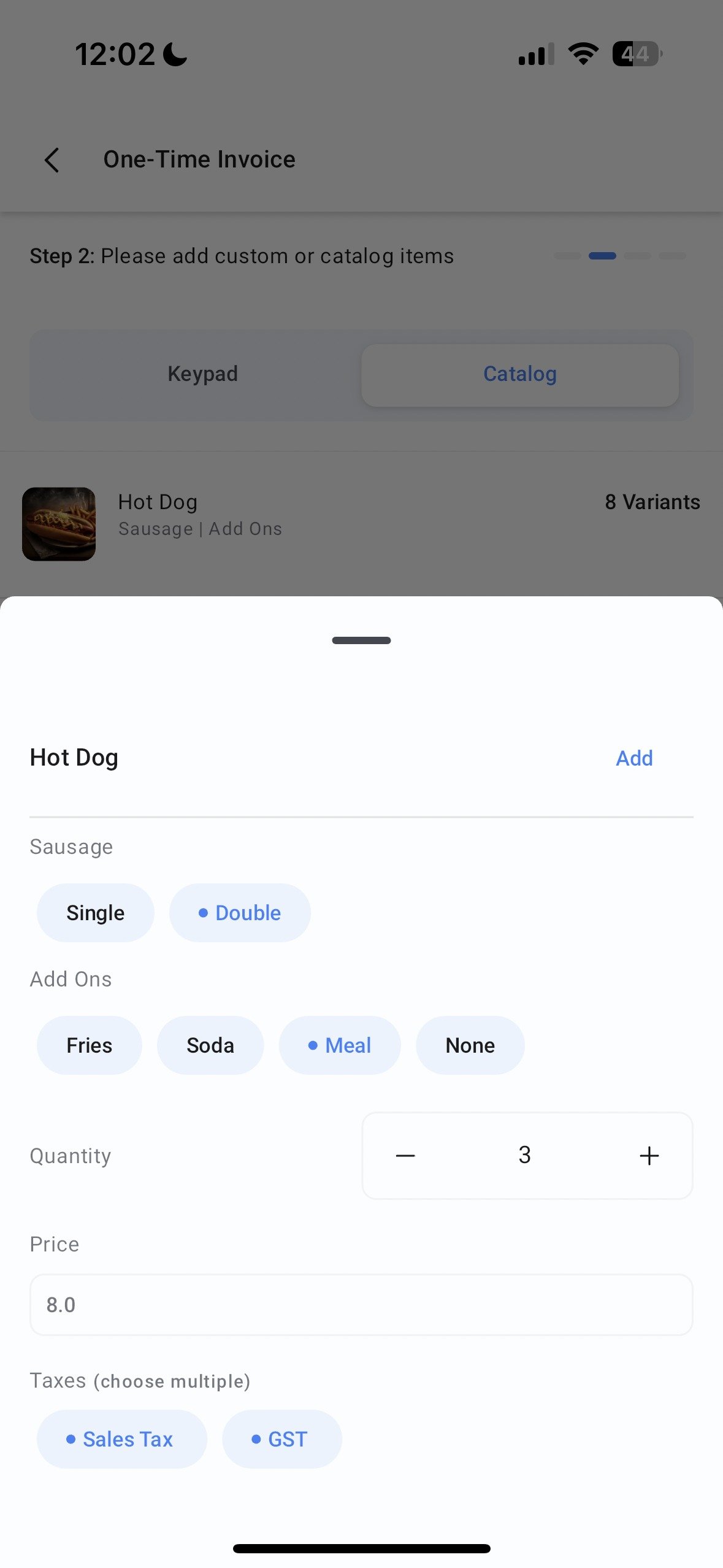 - The second step involves adding items to your invoice. Choose items from your product catalog or add custom items with a note using the keypad section. Select the right variants (if applicable), adjust the quantity, and select the applicable taxes.