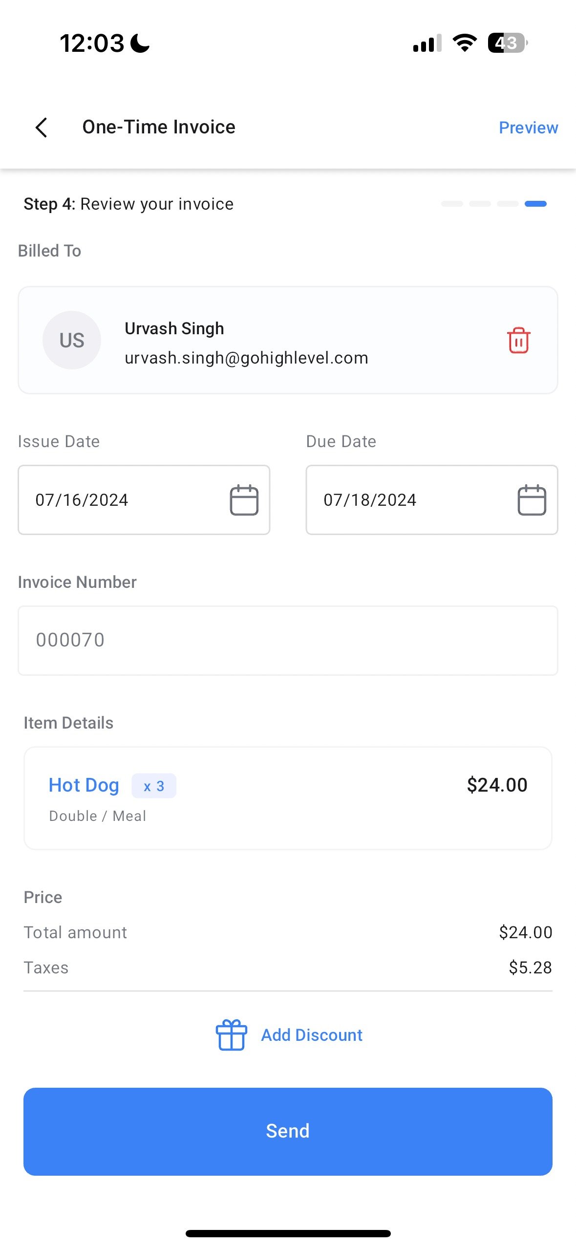 Review and Send – Review your invoice with all the information on a single page. You can also add a discount here.