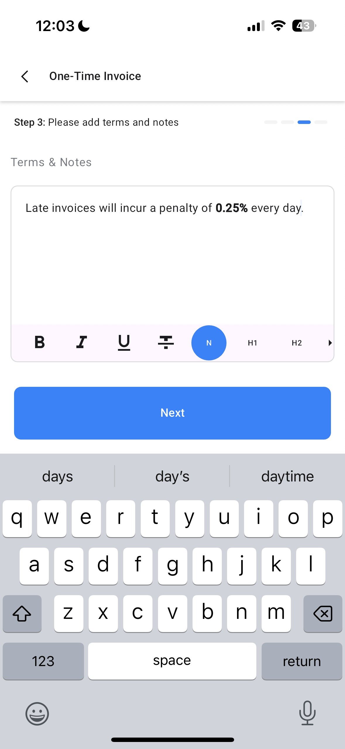 - The third step allows you to review your terms and notes. Here you can lay down the terms of this invoice, including information about late fee if the invoice isn’t paid on time.