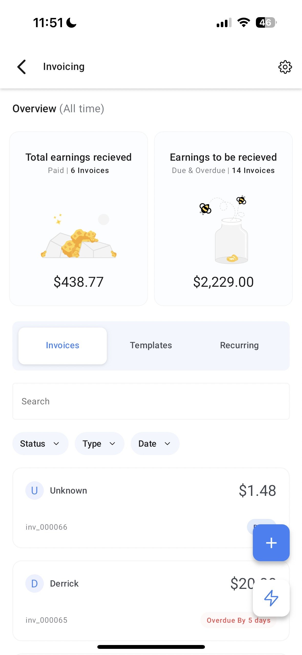 - To create a new invoice, tap on the floating + button on the bottom right of the screen. Choose between a one-time invoice and a recurring invoice.